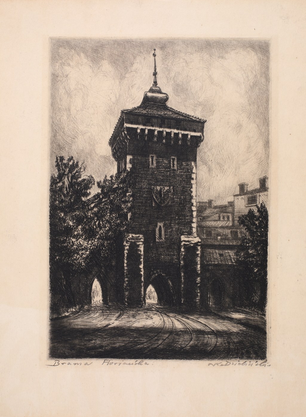 Akwaforta, papier; wym.: 247 x 170 mm; sygn. oł. p. d.: K. Dzieliński; l. d.: Brama Floriańska
