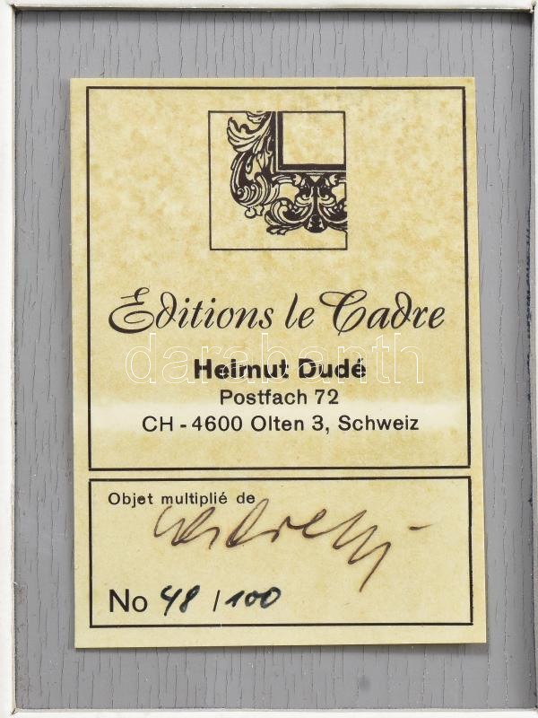 Klf. alkotók (közte Beöthy-Steiner Anna, Fajó János, Forbát Alfréd, Kovács Attila, Ligeti György, Victor Vasarely által tervezett dobozban): Hommage a Carl Laszlo, Editions le Cadre, Basel, 1972. Sokszorosított grafikák és szövegek. Alkotók: Kostas Axelos, Gerlinde Beck, Beöthy-Steiner Anna, Fritz Billeter, Hartmut Böhm, Erich Buchholz, Hsia Chin, Fajó János (szitanyomat, jelzett és 48/105 számozással), Forbát Alfréd (szitanyomat, jelzett és 48/105 számozással), Pietro Gallina, Johannes Grützke, Jiri Kolar, Reinhard Kraft, Werner Krieglstein, Kovács Attila (szitanyomat, jelzett és 48/100 számozással), Walter Leblanc, Ligeti György (jelzetzt, sokszorosított szövegmű), Richard P. Lohse, Thilo Maatsch, Thomas Ring, Amelio Roccamonte, Christian Schad, Friedrich Schröder-Sonnenstern, Claude R. Stange, Klaus Staudt, Jorrit Tornquist, Timm Ulrichs, Victor Vasarely.. Megjelent 100 példányban, amelyből az 1-35 példányok a közreműködők részére foglalt. Az egyes művek részben számozottak, 48/100 vagy 48/105 számozással. Kiadói vászonborítású, fedelén plasztikus dobozban, amely Victor Vasarely sokszorosított. jelzett és számozott 048/100) objektje. Egyes alkotások mérete változó, 12x10 és 15x10 cm között. Doboz alján apró kopásnyomokkal, jó állapotban. Komplett, hiánytalan. Ritka!