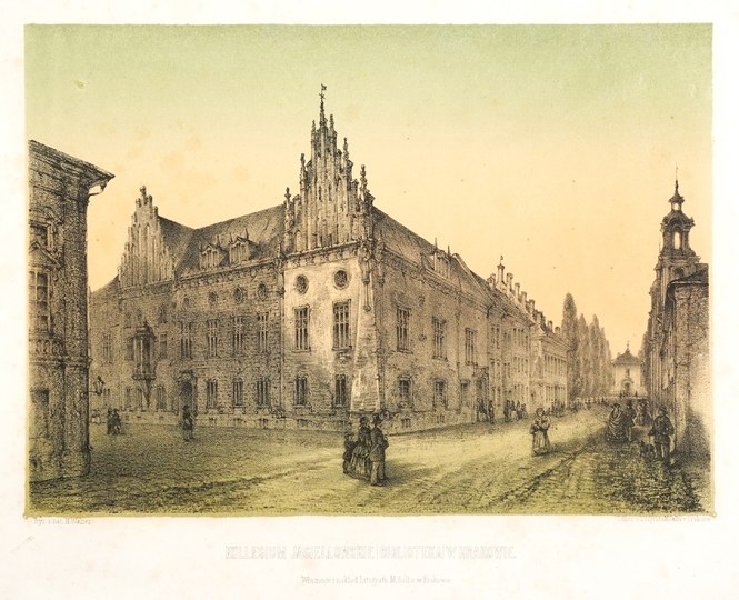J. Banach II 4/20. Widok dawnego budynku biblioteki uniwersyteckiej (Collegium Maius) pochodzący z czwartego lub piątego wydania "Albumu widoków Krakowa" Henryka Waltera (Kraków, po 1865). Tytuł pod kompozycją, tamże nadruki: "Rys. z nat. H. Walter", "Odbito w Litografii M. Salba w Krakowie" oraz "Własność i nakład Litografii M. Salba w Krakowie". Niewielkie uszkodzenie na lewym marginesie, marginesy lekko zaplamione, dolny lekko naddarty, w górnych narożnikach otwory po szpilkach, poza tym stan dobry.
