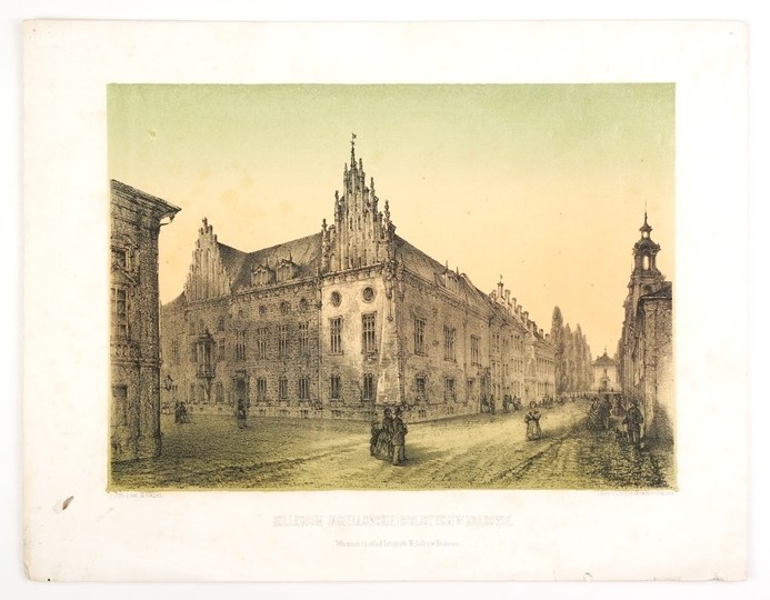 [KRAKÓW]. Kollegium Jagiellońskie (Biblioteka) w Krakowie. Litografia na barwnej tincie, form. 19,2x26,8 cm na ark. 26,4x34 cm.