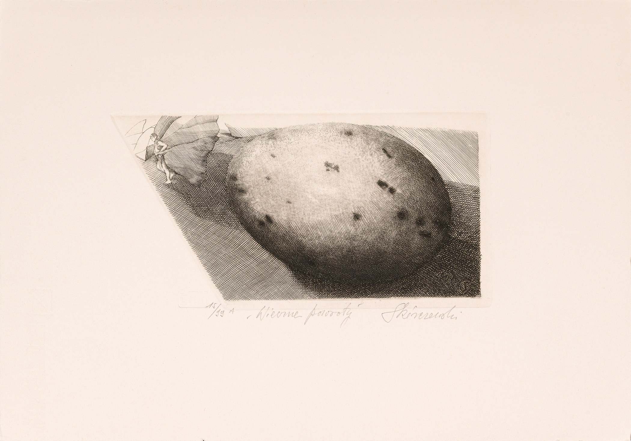 Miedzioryt; wym. komp.: 11 x 21 cm; zachowany pełny arkusz; praca sygnowana i tytułowana ołówkiem; praca także sygnowana i datowana na płycie, w obrębie kompozycji; egz. 15/99 A; poniżej kompozycji suchy tłok: Imp. MK.
