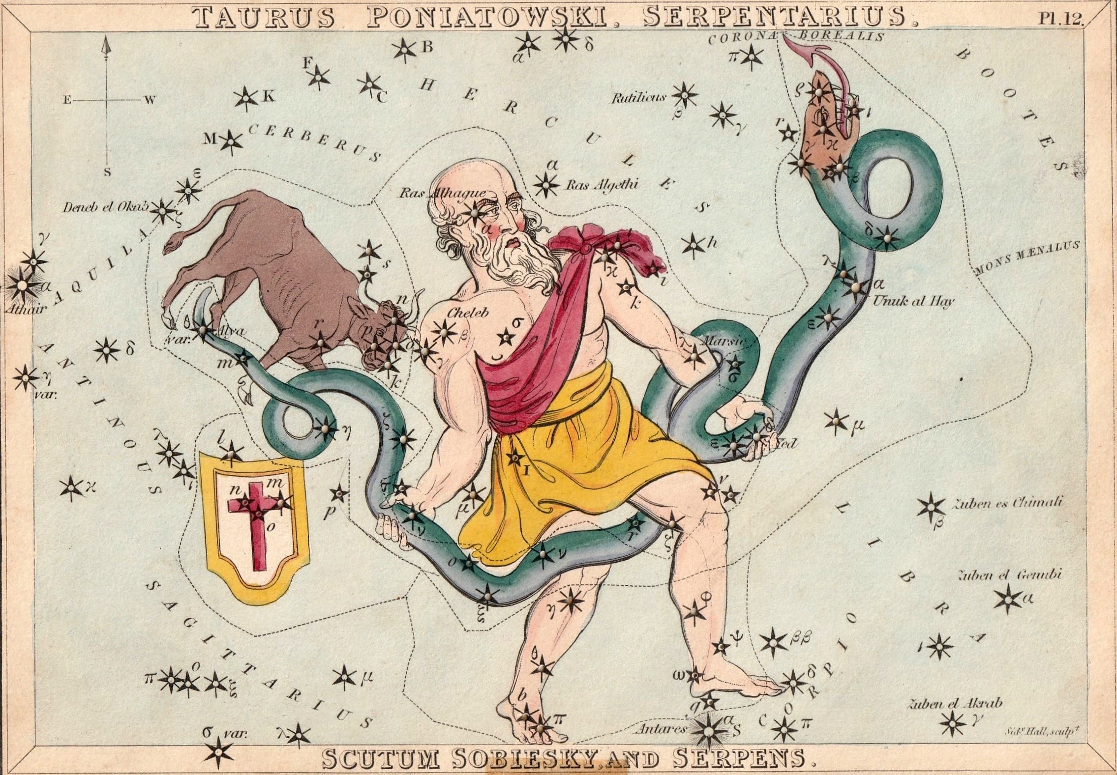 LUSTRO URANII. Plansza nr 12 z Urania’s Mirror (wydawnictwo znane też jako Lustro/Zwierciadło Uranii lub Widok Niebios – zestaw pudełkowy zawierający serię 32 kart przedstawiających mapę nieba i poszczególne gwiazdozbiory, opubl. po raz pierwszy w 1824 r.); ilustr. oparto na atlasie nieba autorstwa A. Jamiesona, ryt. S. Hall; karta przedstawia następujące gwiazdozbiory: Ciołek Poniatowskiego, Wężownik, Tarcza Sobieskiego i Wąż; perforacja umożliwiająca podziwianie układu gwiazd pod światło; stal. kolor., st. bdb., do verso taśmą przymocowana bibuła; wym. arkusza 198x138 mm; TAURUS PONIATOWSKI, SERPENTARIUS, SCUTUM SOBIESKY, AND SERPENS.