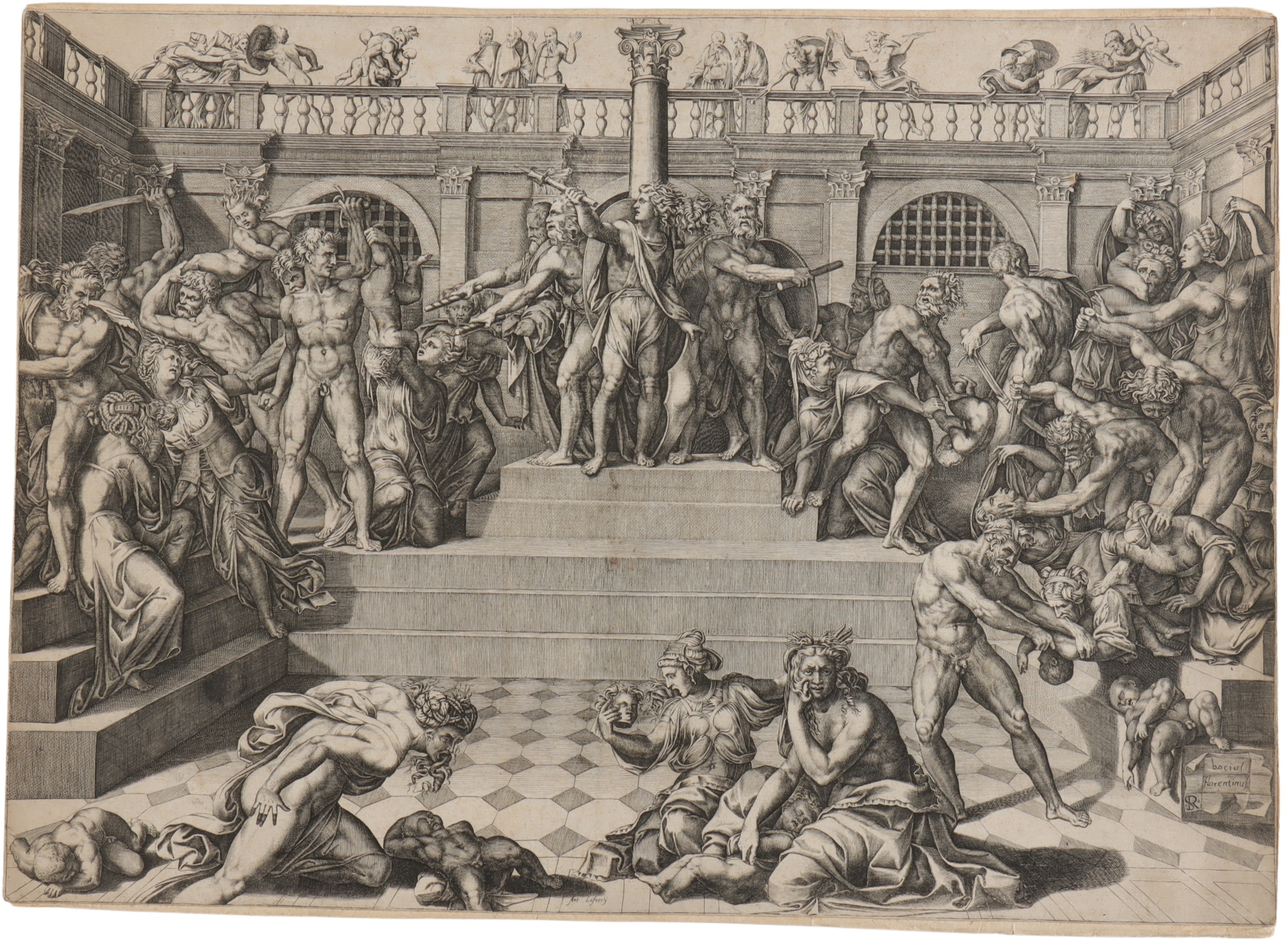 Engraving, 405 x 572 mm. Second state, with the address of Antonio Lafreri. Bartsch XIV.24.21.A