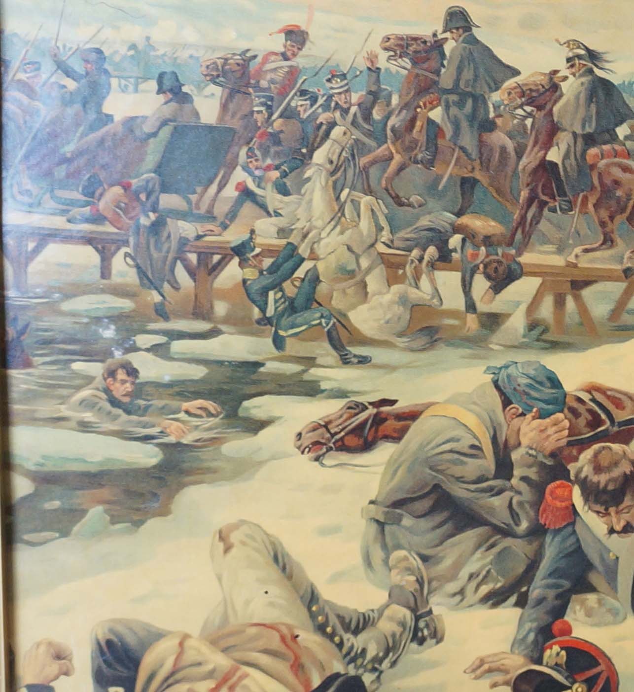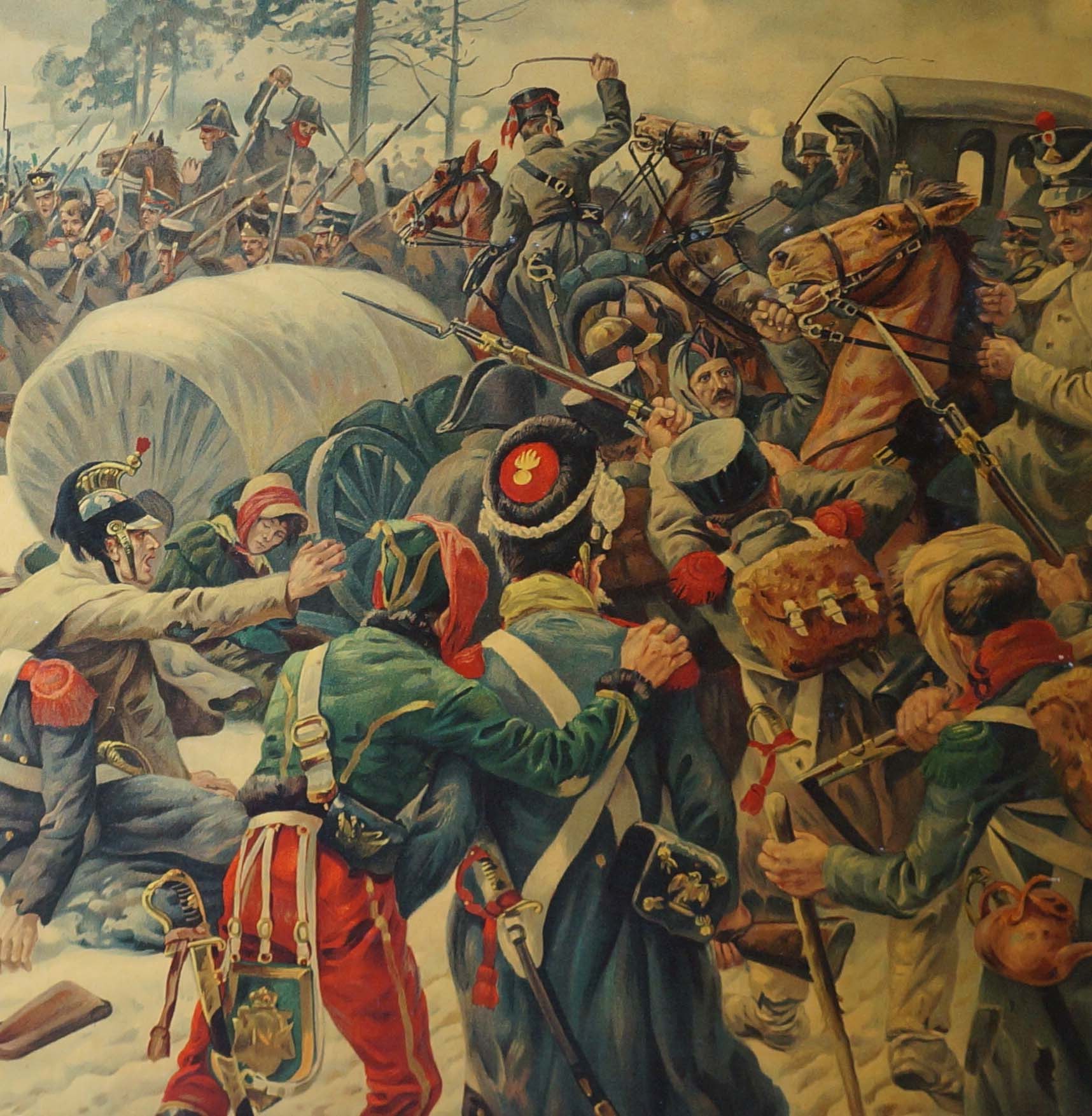 Odwrót wojsk Wielkiej Armii Napoleona z Rosji w 1812 roku - oleodruk na płycie, f. 68x 48cm w świetle ramy, 82,5x63,5cm [rama]