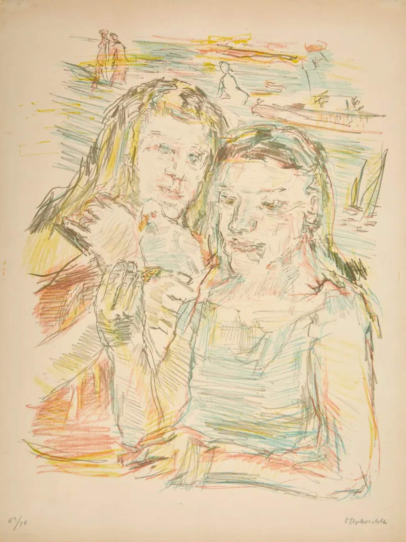 Symboliczna i poetycka kompozycja „Zwei Mädchen mit Taube” (Dwie dziewczynki z gołębiem) autorstwa Oskara Kokoschki ukazuje dziecięcą intymność, łagodność i niewinność w typowo ekspresyjnej, kolorystycznej stylistyce artysty. Kompozycja wyróżnia się spontanicznym ruchem kreski i intensywnym światłem barw, które stapiają figury z przestrzenią. Gołąb – uniwersalny symbol pokoju – może być tu także alegorią kruchego świata dzieciństwa lub nadziei. Praca pochodzi z limitowanej edycji 70 odbitek, ręcznie sygnowanych przez artystę.