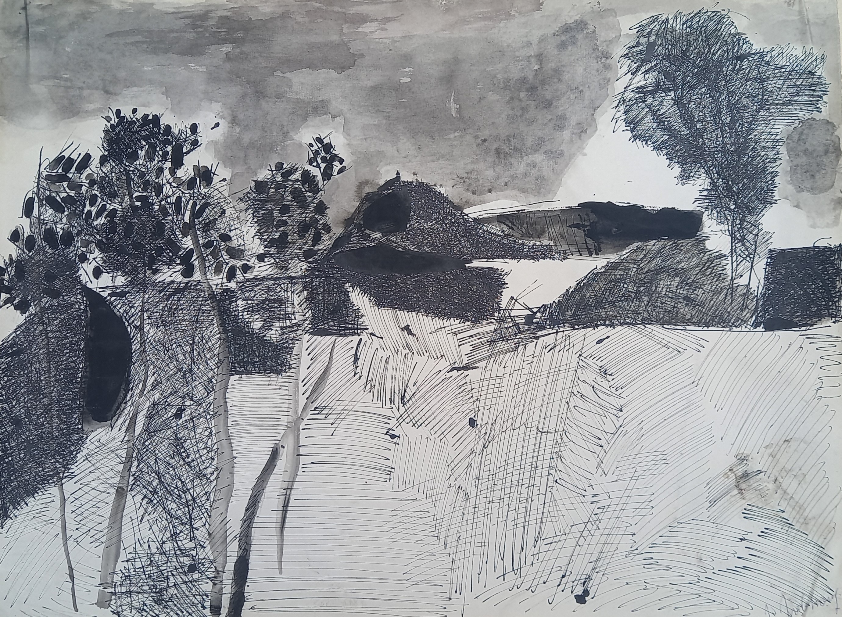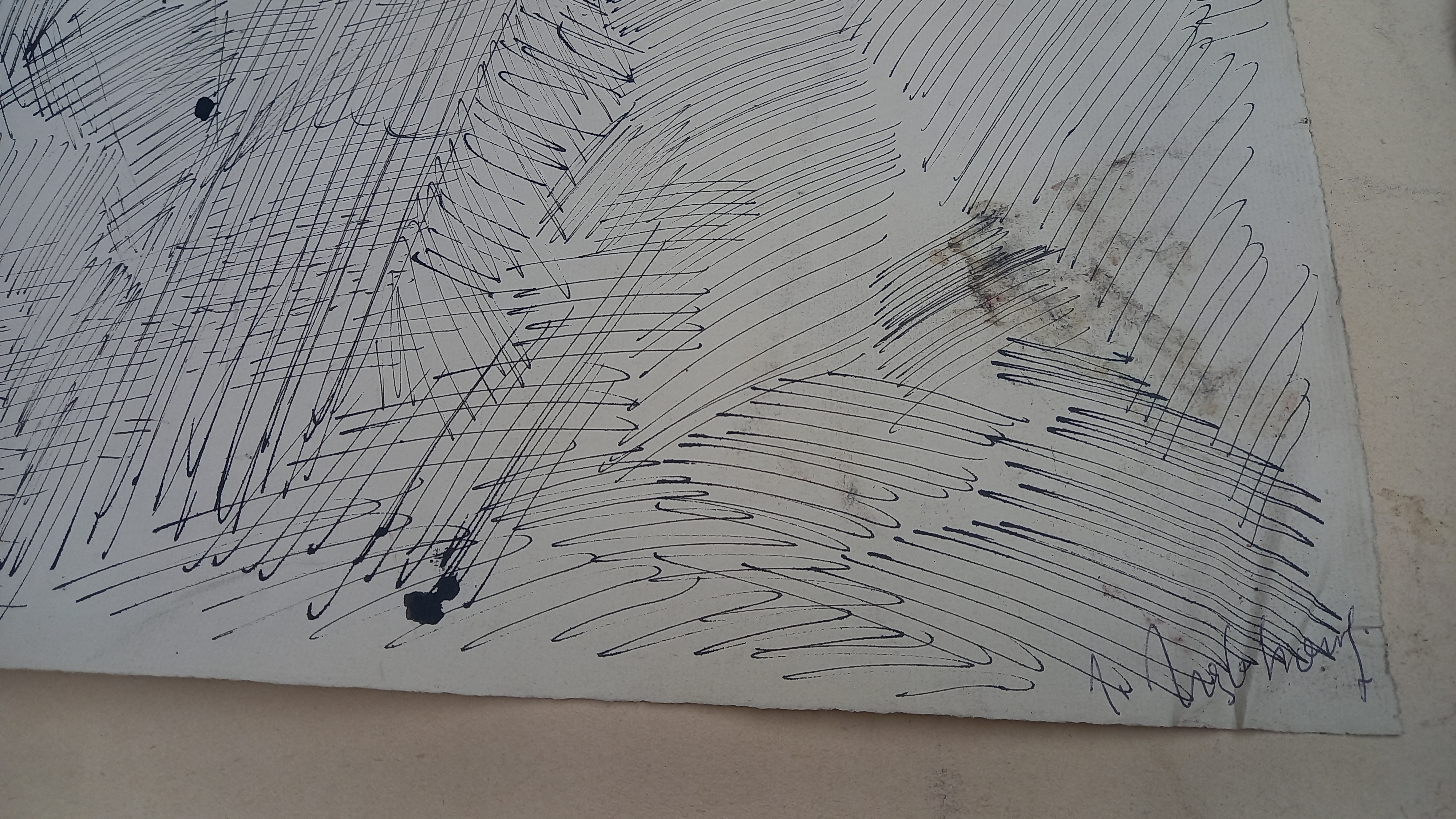 Tusz , tusz lawowany / papier , sygn. p./d. format 47 X 65 cm.
