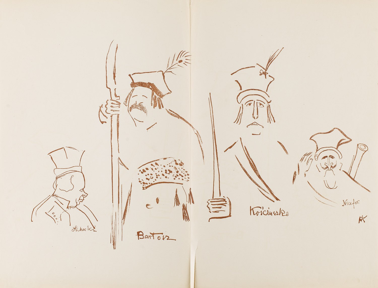 12. Karol Frycz (1877-1963),Zelwerowicz, Kotarbiński i Jednowski jako Lichocki, Bartosz i Nicefor oraz Kościuszko w sztuce Anczyca "Kościuszko pod Racławicami", litografia/ papier, 47,5 x 63 cm