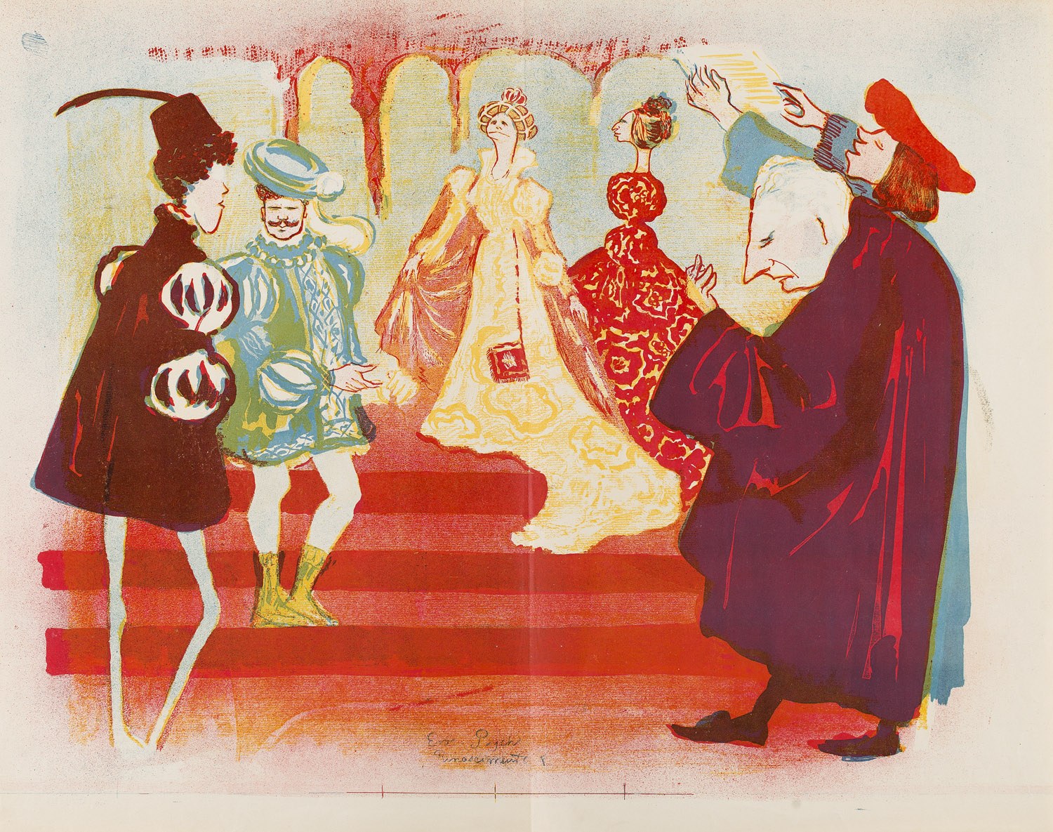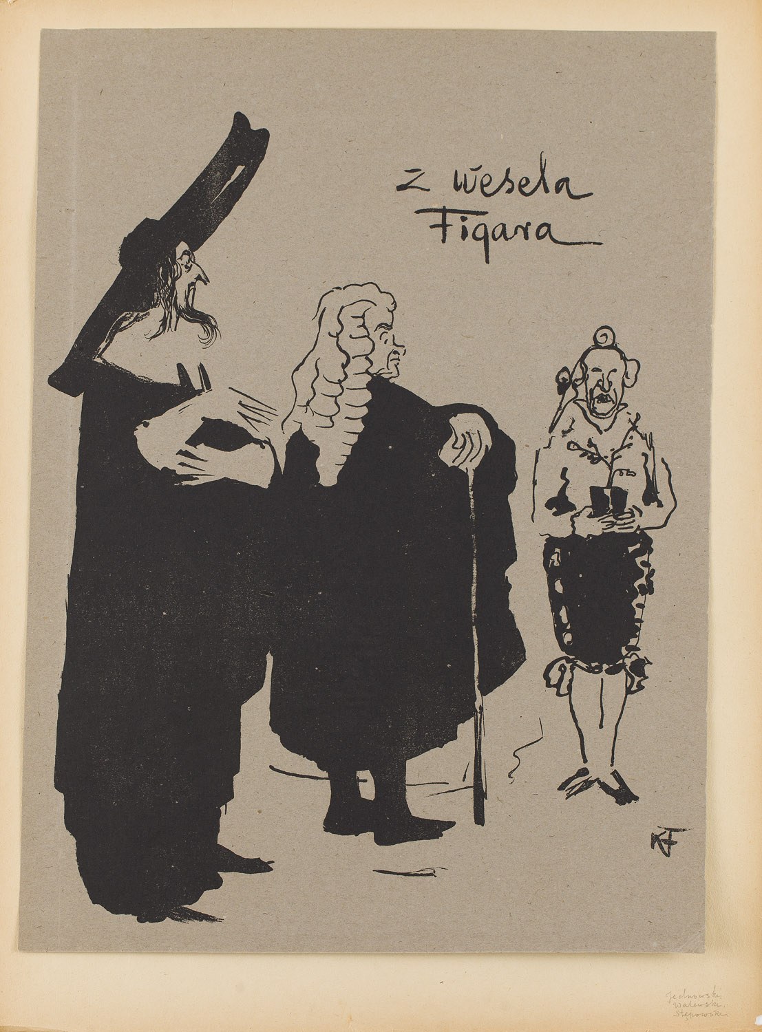 2. Karol Frycz (1877-1963), Marian Jednowski, Adolf Walewski i Leon Stępowski w sztuce "Wesele Figara", litografia/ papier, 44 x 35 cm