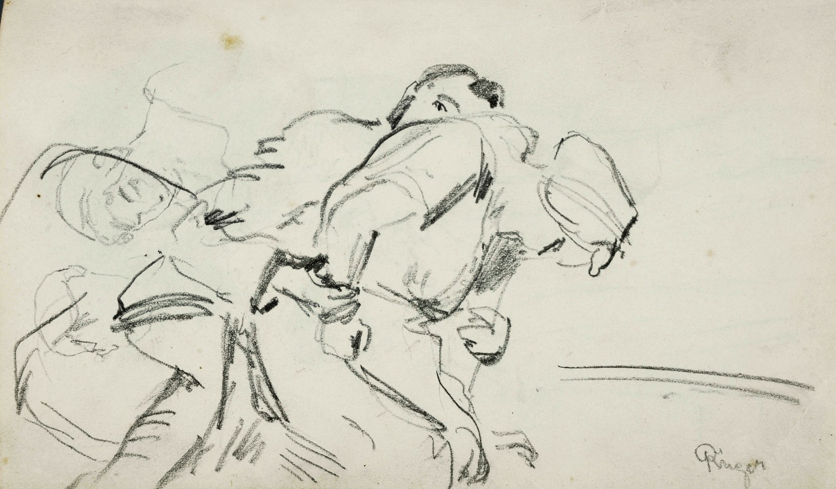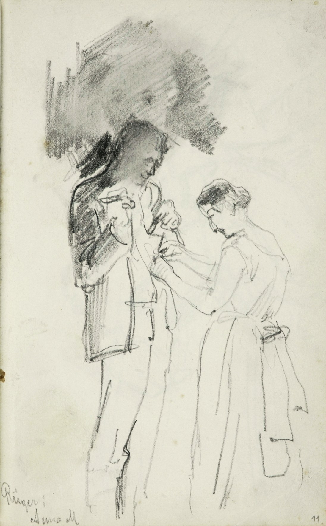 verso: Mężczyzna z kobietą na kolanach; u dołu z prawej napis autorski Rüger.