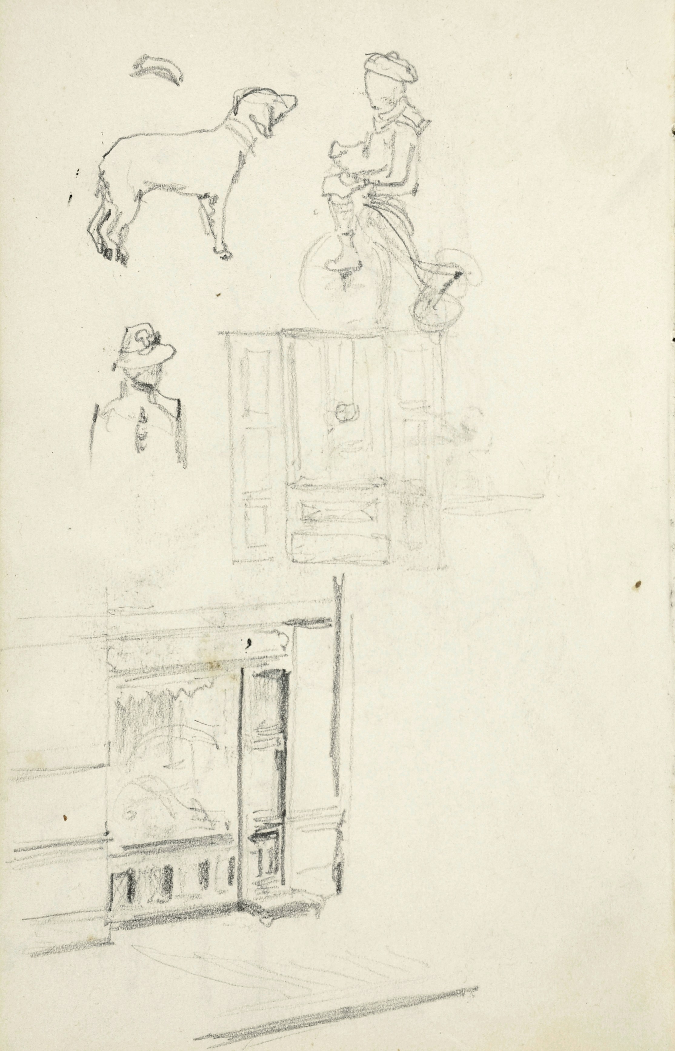 Luźne szkice: chłopczyk na rowerku i pies oraz witryny sklepowej i popiersia kobiety ukazanej od tyłu.