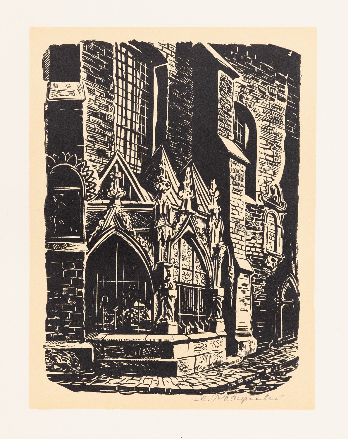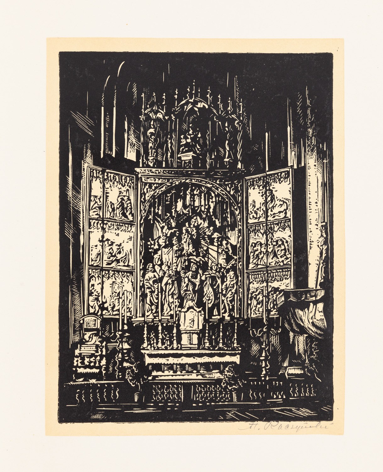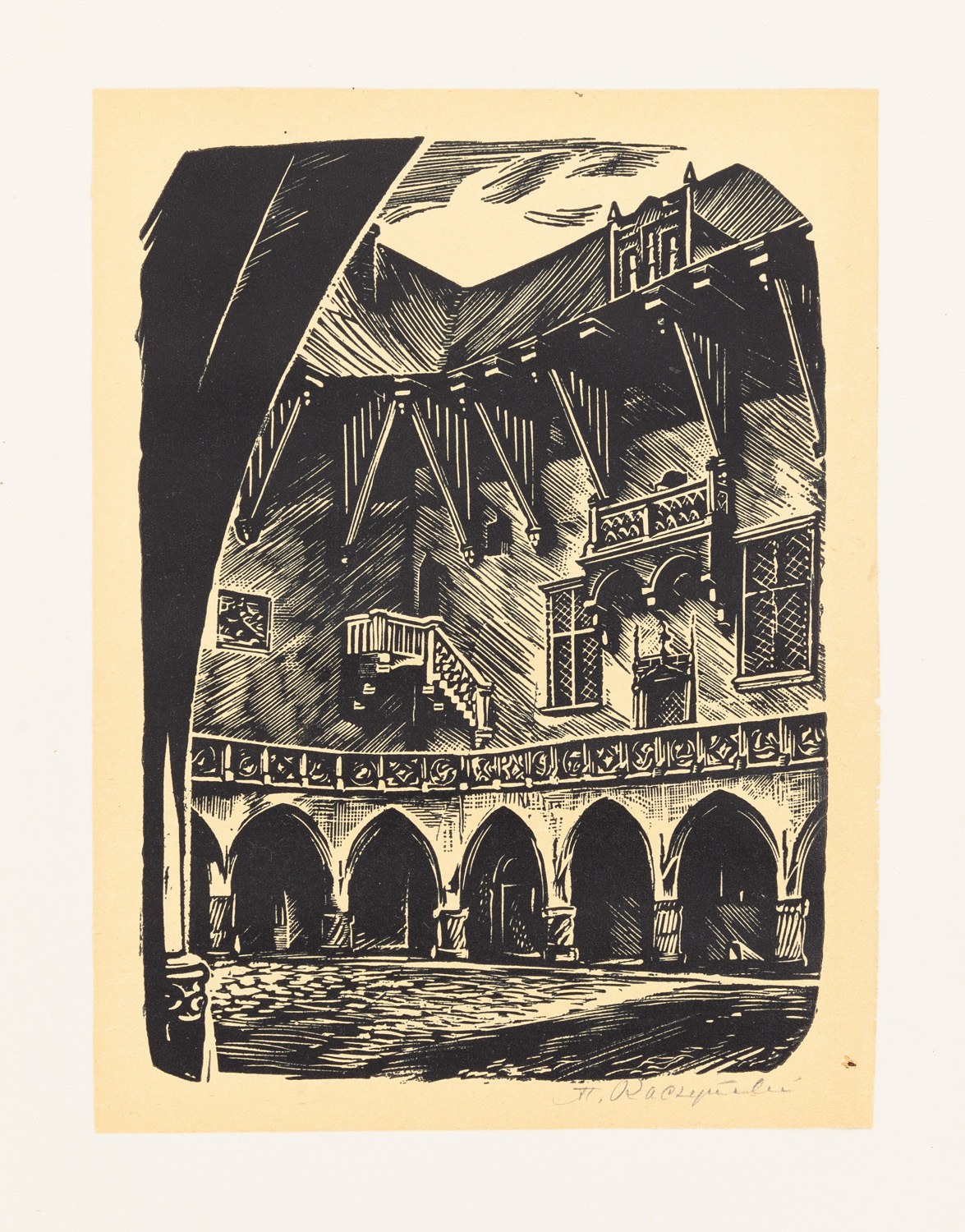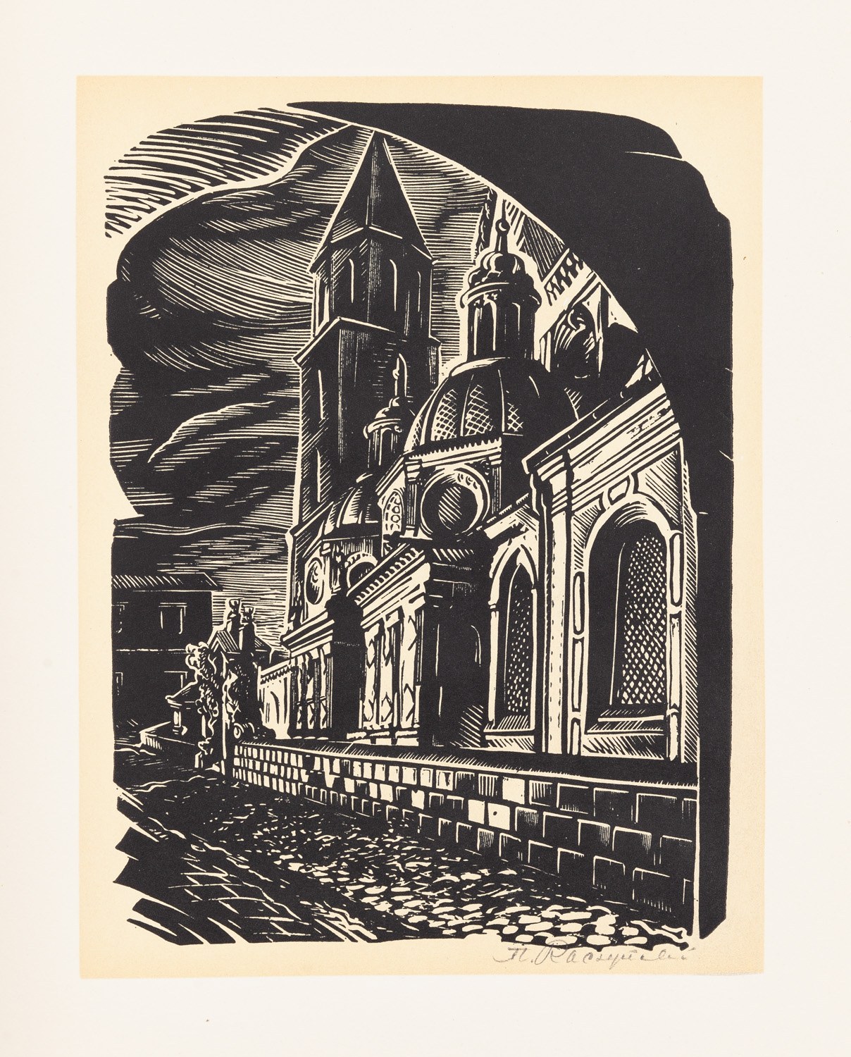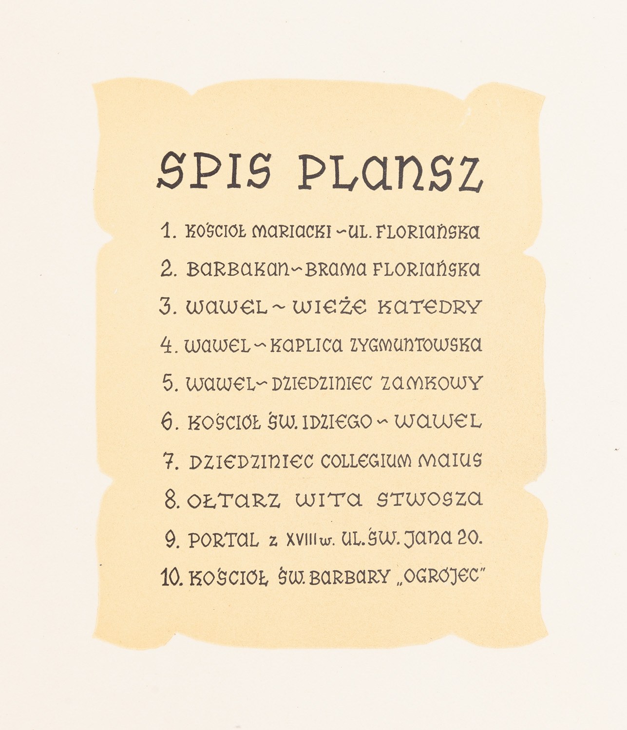 Kompletna teka zawierająca 10 drzeworytów: Kościół Mariacki, Barbakan, Wieże Katedry, Kaplica Zygmuntowska, Dziedziniec Zamkowy, Kościół św. Idziego, Dziedziniec Collegium Maius, Ołtarz Wita Stwosza, Portal z XVIII w., Kościół św. Barbary