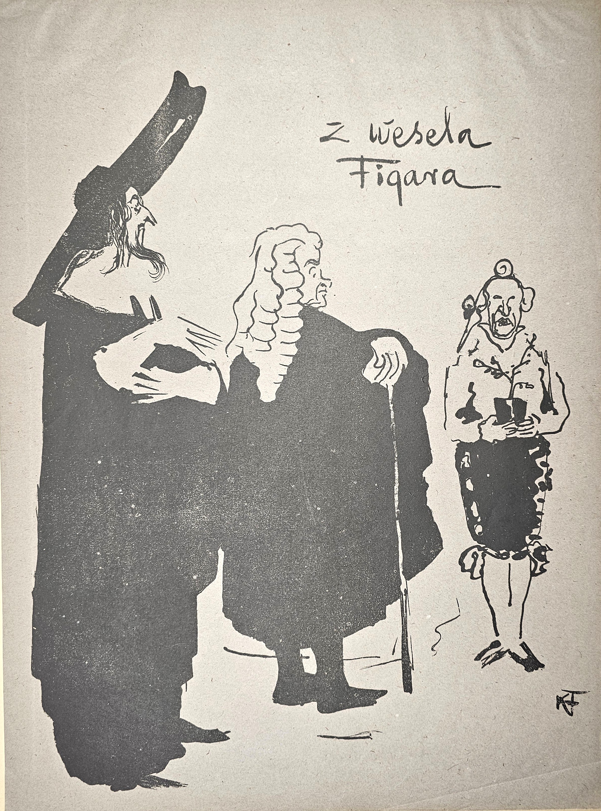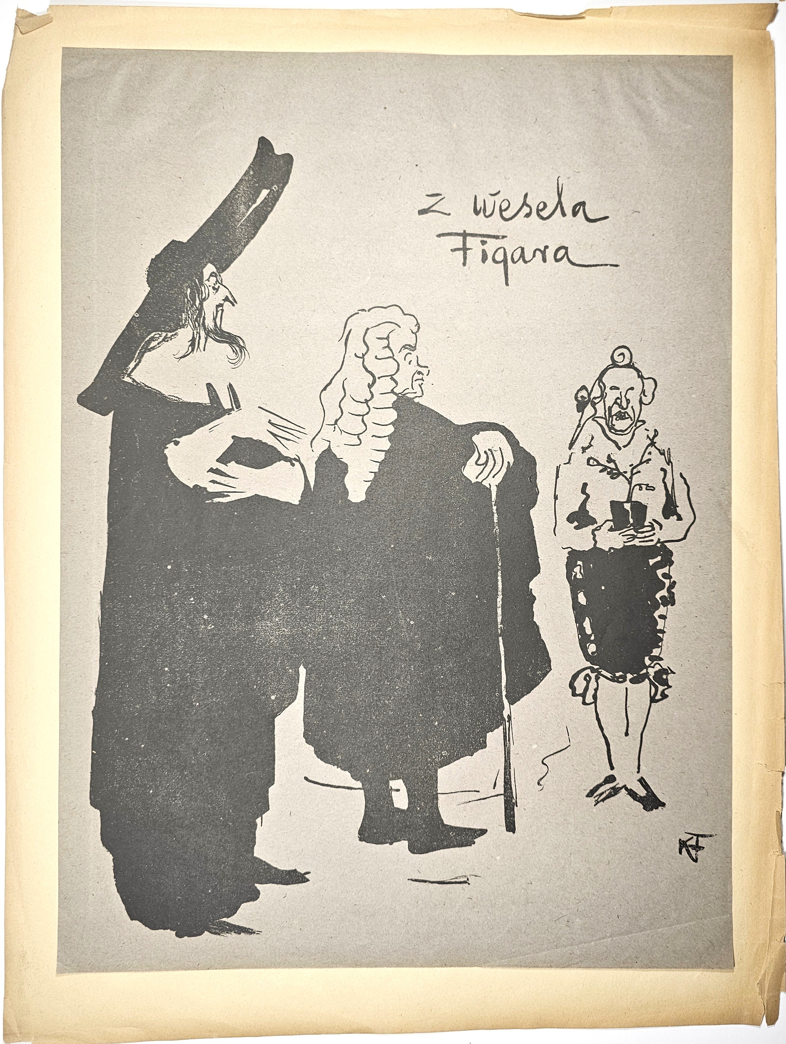 Karykatura, litografia, sygnowana na płycie p.d.: KF, na górze kompozycji, po środku napis: Z Wesela Figara; wym.: 45 x 33 cm, umieszczona na oryg. papier. podkładzie. Marginesy podkładu nieznacznie zagięte, stan litografii bardzo dobry. Rycina pochodzi z "Teka Melpomeny" wyd. w Krakowie w 1904 r. w Zakł. Litogr. A. Pruszyńskiego.