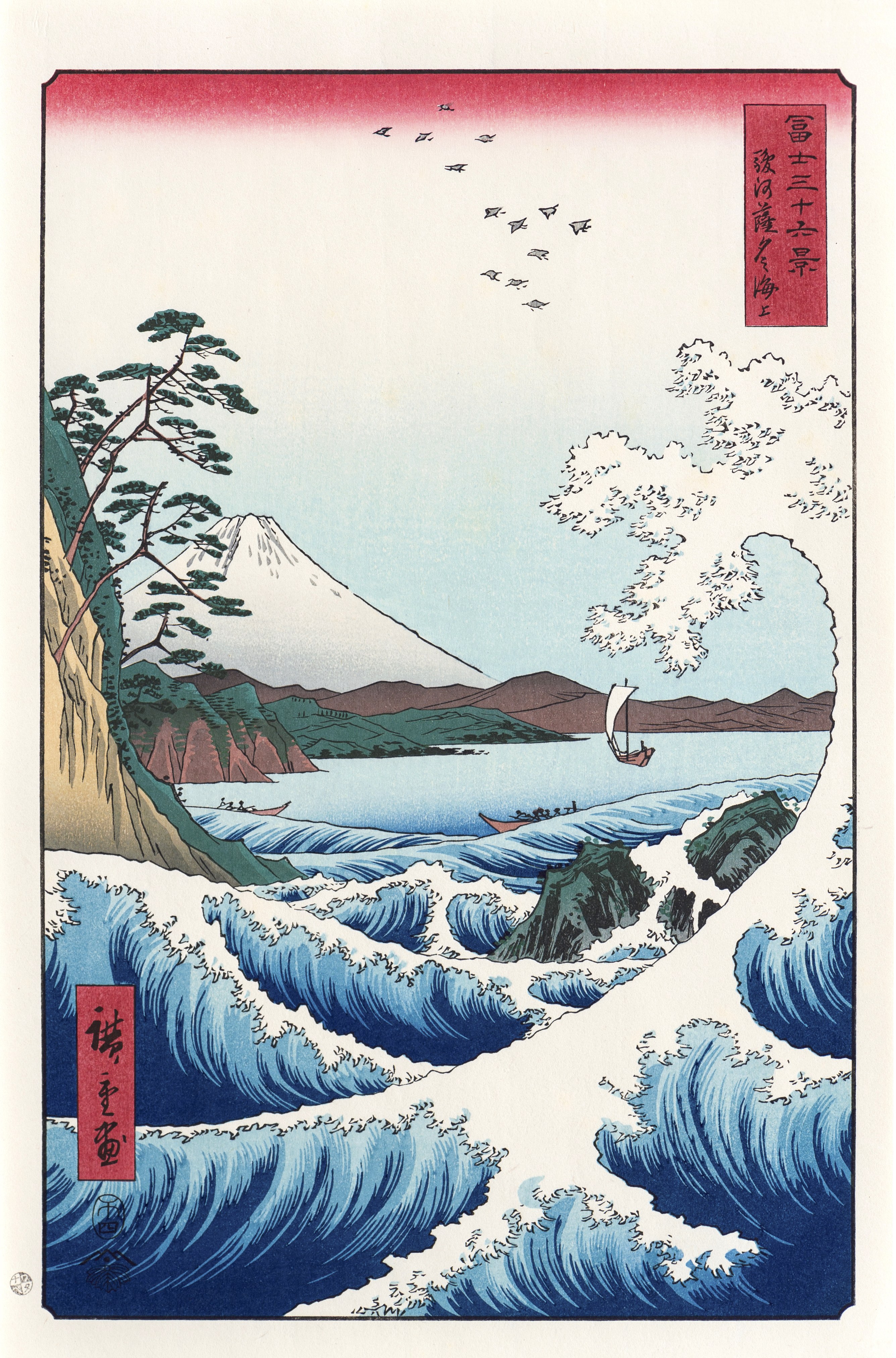 „Trzydzieści sześć widoków góry Fuji”. W Japonii góra Fuji jest świętym miejscem i symbolem kraju. Wznosząca się majestatycznie w pobliżu centrum Japonii, Fuji dominuje w krajobrazie i tożsamości narodowej Japończyków. Hiroshige ukończył projekty swojej ostatniej serii, „Trzydzieści sześć widoków góry Fuji” w 1858 roku. Podążając za tradycją ustanowioną przez Hokusai, wspaniała seria Hiroshige przedstawia górę w każdej z czterech pór roku, z różnych punktów widokowych. Hiroshige wykorzystał pionowy format oban, aby stworzyć dramatyczne i zapierające dech w piersiach widoki tego najbardziej czczonego zabytku. Widoki obejmują miejskie centrum Edo, podziwianie kwiatów wiśni w małej wiosce oraz fantastyczne fale rozbijające się o brzeg w Awa. Rzadziej spotykana niż niektóre z jego bardziej znanych serii, „Trzydzieści sześć widoków góry Fuji” jest jedną z najlepszych serii Hiroshige w formacie pionowym.