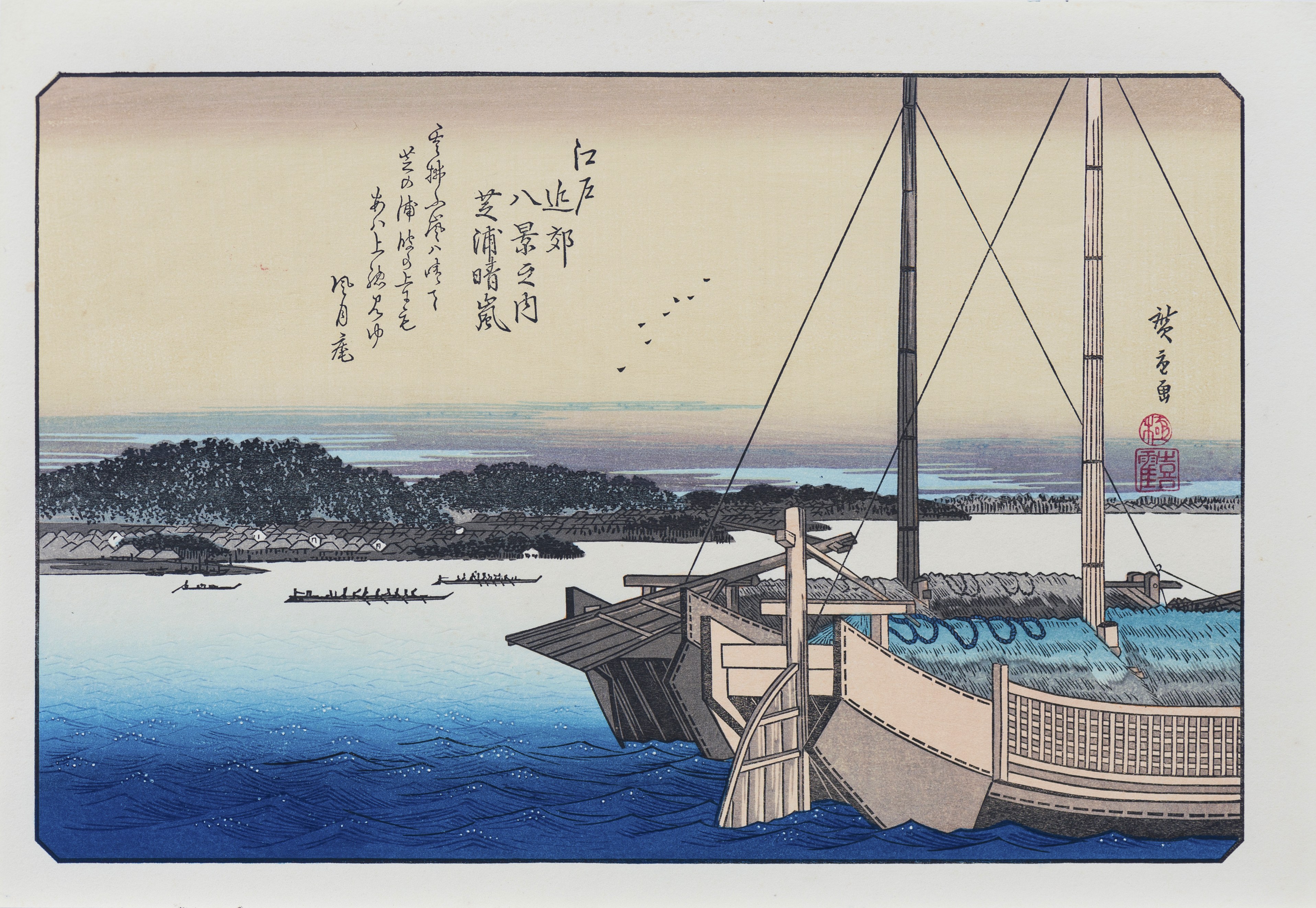 Odległy widok niskich wzgórz w Takanawa widzianych z morza. Kontrast do wzgórz tworzą wysokie maszty dwóch zakotwiczonych statków. Na niebieskich falach z lewej strony unoszą się z białe bąbelki piany. Bardzo nastrojowe projekt Hiroshige. Jeden z wierszy spisanych u góry autorstwa Bandaisha Kazuhisa w wolnym przekładzie brzmi następująco: Jakże piękne jest morze w Shibaura po burzy! Szczyty chmur wydają się być oczyszczone przez fale.