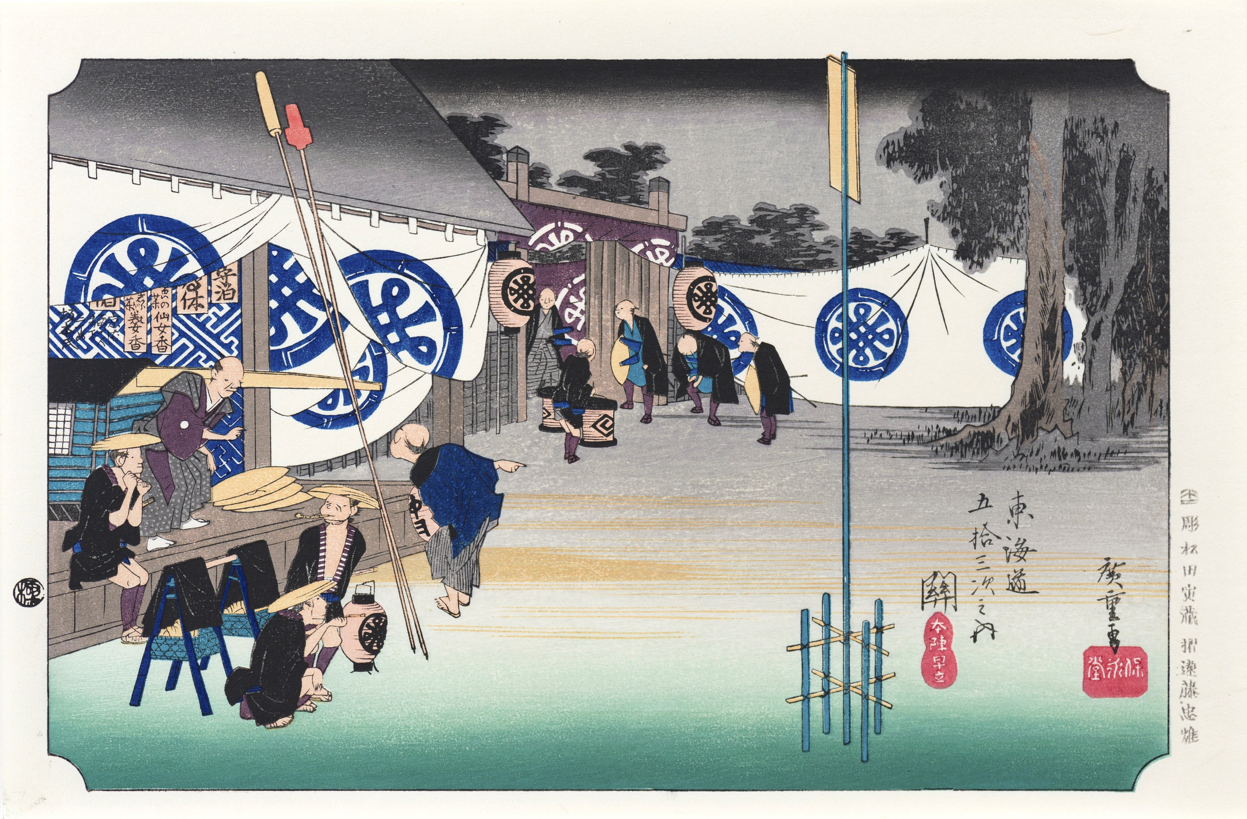 W 1832 roku Hiroshige podróżował ze świtą urzędników szoguna z Edo (Tokio) do Kioto wzdłuż drogi Tokaido. Podróż ta była dla niego otwierającym oczy i zmieniającym życie doświadczeniem. Po podróży wrócił do Edo i rozpoczął prace nad serią drzeworytów na podstawie szkiców, które wykonał. Opublikowana w latach 1833-1834 seria „Pięćdziesiąt trzy stacje Tokaido” (Hoeido Tokaido) przyniosła Hiroshige ogromne uznanie zarówno krytyków, jak i publiczności. Umiejętnie uchwycił nastrojowe i klimatyczne warunki pogodowe, oddając mgłę, deszcz, śnieg i wieczorne efekty świetlne. Poetyckie krajobrazy zrównoważył dodając postacie, które stanowią osobisty element tych prac. Seria oferuje widzom możliwość przeniesienia się w czasie do Japonii Hiroshige w cieniu szogunatu Tokugawa i zobaczenia tego życia tak, jak doświadczył go artysta. Seria stała się tak popularna, że ciągłe jej wznawianie w czasach Edo spowodowało całkowite zniszczenie matryc pierwszego wydania.