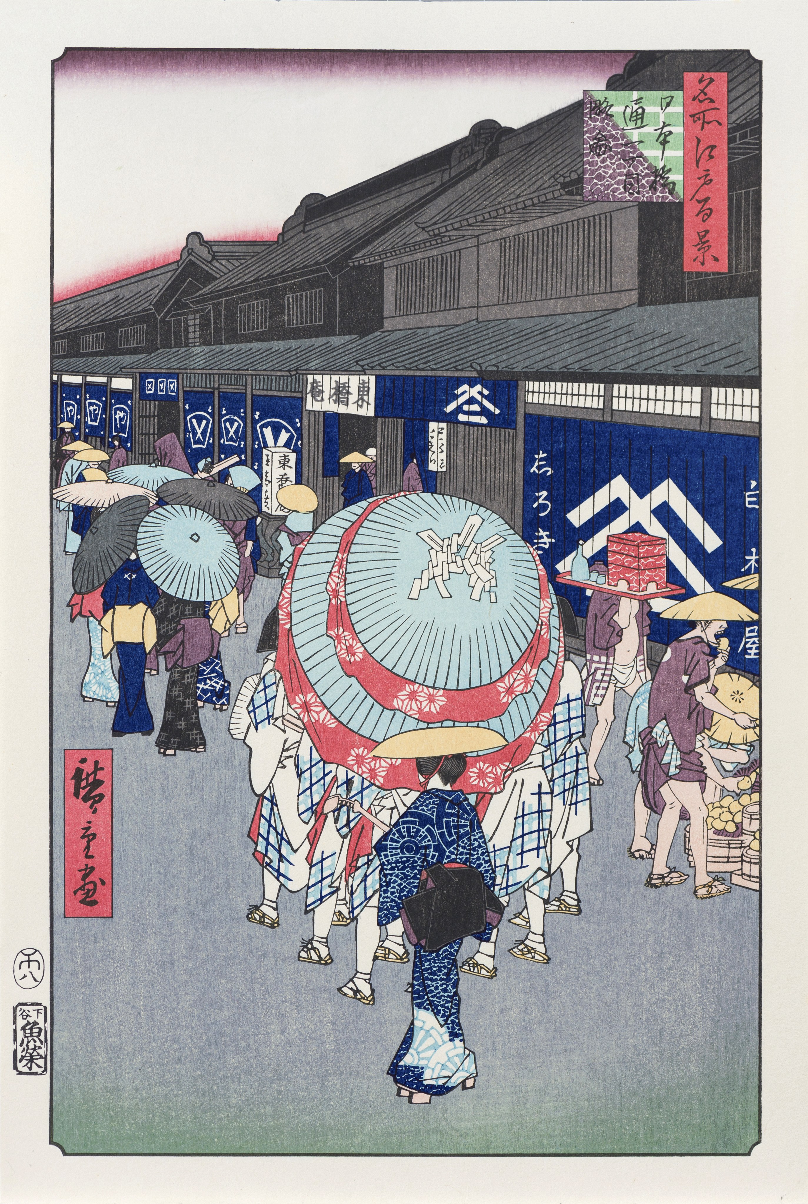 Widok na ulicę Nihonbashi itchōme z cyklu „100 słynnych widoków Edo”. Sklep Shirokiya pokazany po prawej stronie rozwinął się w jeden z największych domów towarowych w mieście i ostatecznie stał się częścią Tokyu Group.