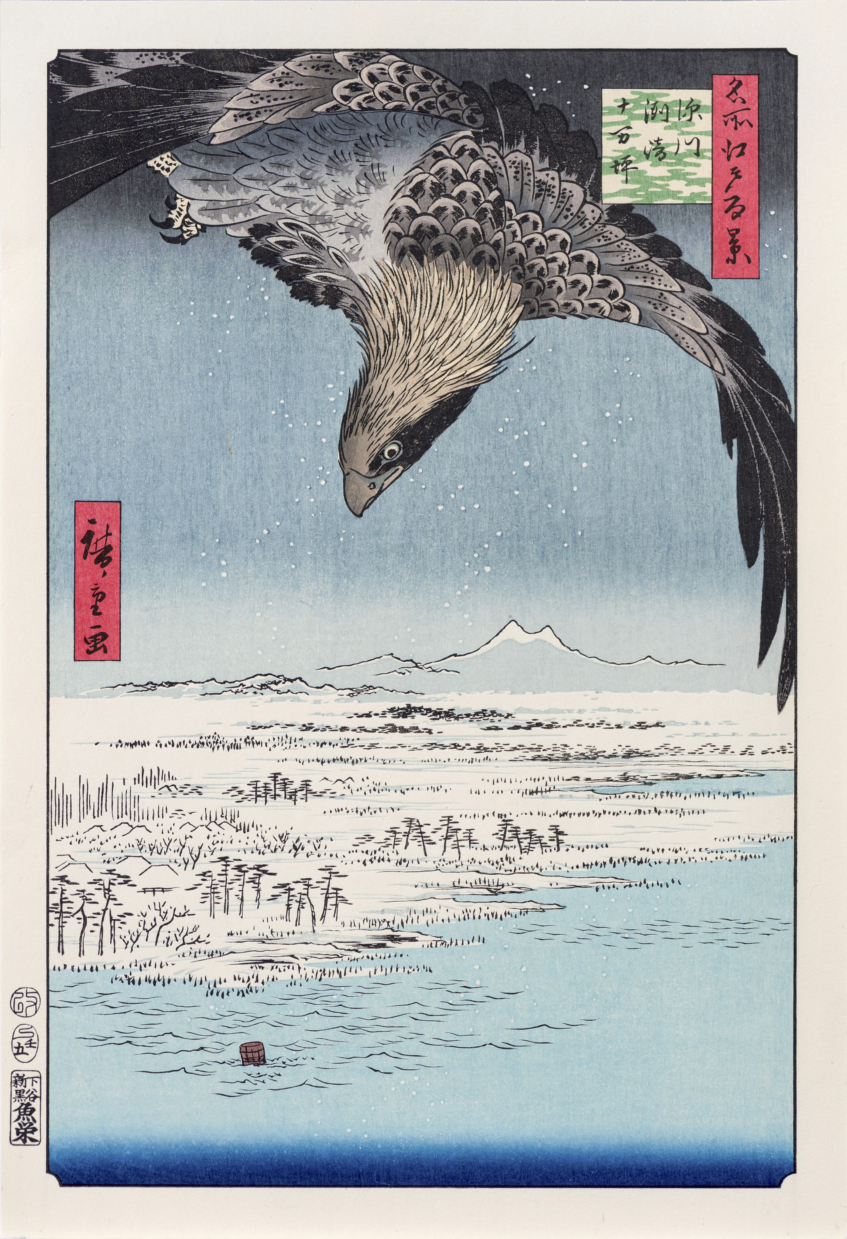 Hiroshige Andō, zwany także Hiroshige Utagawa, to jeden z najbardziej znanych japońskich malarzy i grafików. Jego ojciec, Andō Genuemon, był samurajem niskiej rangi i oficerem brygady strażackiej. Od szesnastego roku życia Hiroshige kształcił się w pracowni Utagawy Toyohiry, pod którego pod opieką rozwijać umiejętności i talent. Młody Hiroshige nasiąkał artystyczną atmosferą, jednocześnie pomagając w codziennym życiu brygady ojca. Dopiero w wieku 27 lat postanowił w zupełności pójść drogą twórczości artystycznej. Po śmierci nauczyciela w 1822 r. zaproponowano mu objęcie pracowni po mistrzu, jednak Hiroshige zrezygnował z oferty i postawił na samodzielność. Dorobek artystyczny Hiroshige do dziś nie został w pełni skatalogowany, ale szacuje się, że powstało około 5000 dzieł, przede wszystkim w technice barwnego drzeworytu. Swoją karierę zaczynał od portretów pięknych kobiet (bijin-ga) i wizerunków aktorów kabuki (yakusha-e), ale po śmierci swojego nauczyciela skoncentrował się przede wszystkim na rodzimym pejzażu. Hiroshige pochodził z rodziny samurajskiej, jednakże identyfikował się z mieszczańską kulturą Edo. Zasłynął przede wszystkim jako twórca serii krajobrazowych takich jak: Pięćdziesiąt trzy stacje na gościńcu Tōkaidō (Tōkaidō gojūsan tsugi no uchi), Sto widoków słynnych miejsc w Edo (Meisho Edo hyakkei) i Sześćdziesiąt dziewięć stacji na drodze Kisokaidō (Kisokaidō rokujūkyū tsugi no uchi). W mistrzowski sposób ukazywał pejzaż w różnych porach roku i dnia, interesowały go zjawiska pogodowe. Eksperymentował z efektami i kompozycją, stosował niekonwencjonalne skróty. Wyjątkowym elementem w jego pracach jest przedstawianie zjawisk atmosferycznych takich jak opady śniegu czy deszczu oraz wichury i burze. Z drugiej strony interesowało go zjawisko cienia i jego działanie zarówno w krajobrazie, jak i domowym wnętrzu.