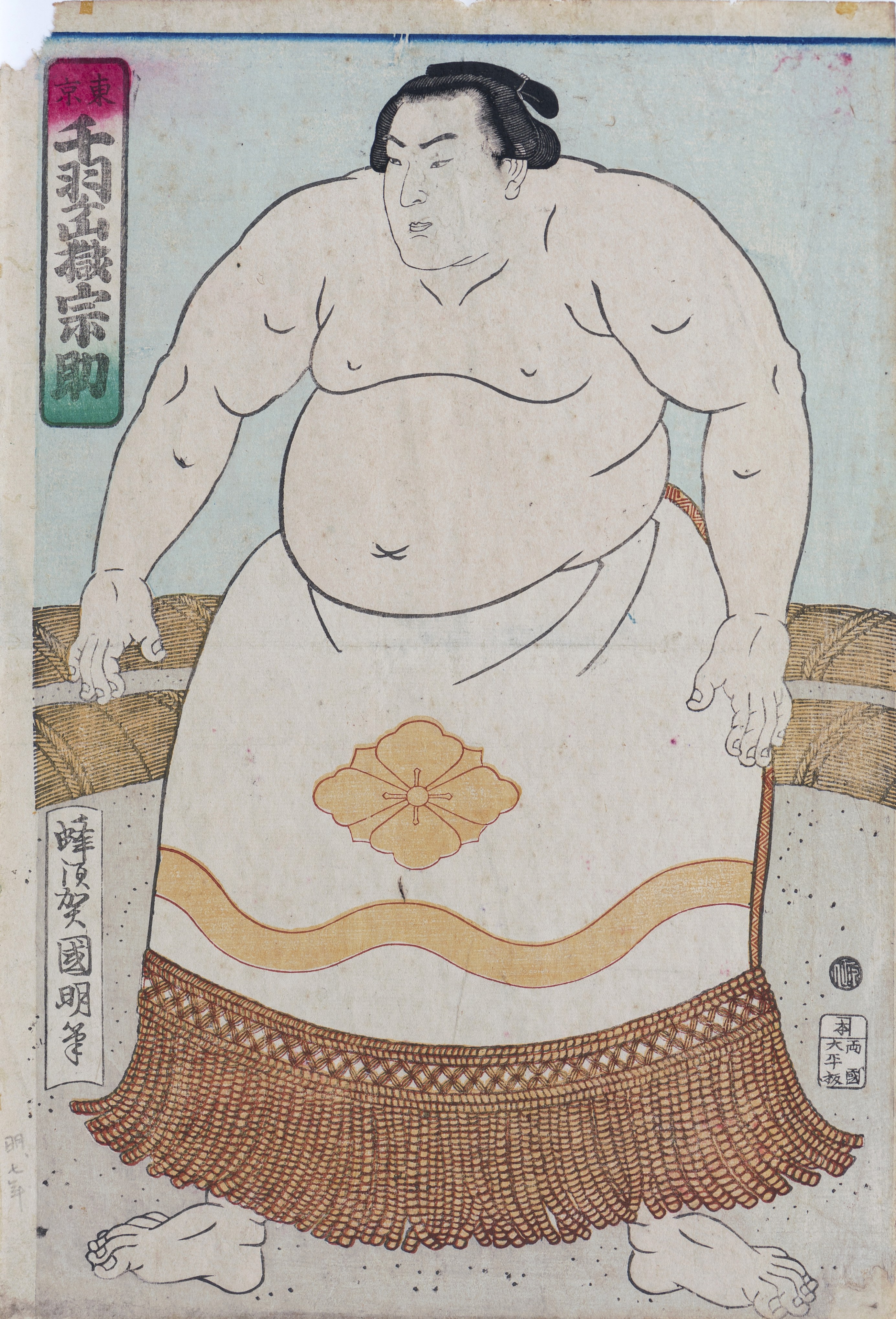 Starożytny sport japońskich zapasów sumo okazał się popularnym tematem dla artystów drukujących drzeworyty w epokach Edo i Meiji. Portrety poszczególnych mistrzów zapasów często przedstawiają ich podczas ceremonii wejścia na ring, noszących ceremonialny pas i fartuch obszyty frędzlami. Inne projekty pokazują sportowców w akcji podczas meczów, z sędzią i sędziami oraz publicznością. Zawody odbywały się czasami na terenie świątyni, aby zebrać fundusze na świątynię, z tymczasowymi arenami wzniesionymi specjalnie na to wydarzenie.