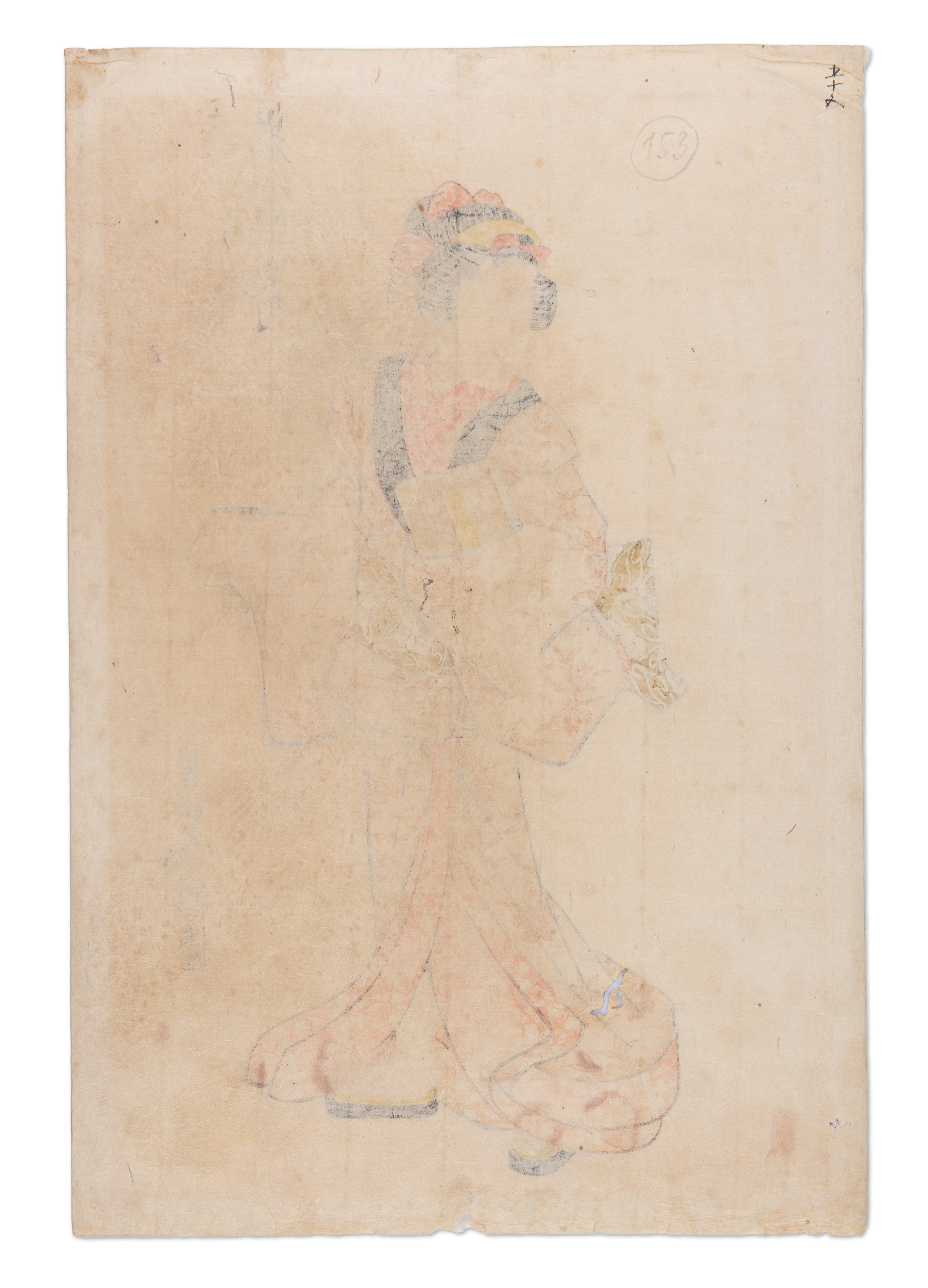 Woodcut depicting an elegant figure of a woman in a richly patterned kimono holding a book. The author Utagawa Kunisada, also known as Toyokuni III, was one of the most prominent representatives of the Utagawa school and was a highly regarded creator of the bijin-ga (paintings of beautiful women) and kabuki-e (portraits of actors). The signature "豊国画" (Toyokuni ga) and publisher's marks are printed on the right side of the leaf. This print also bears an inscription identifying the depicted figure