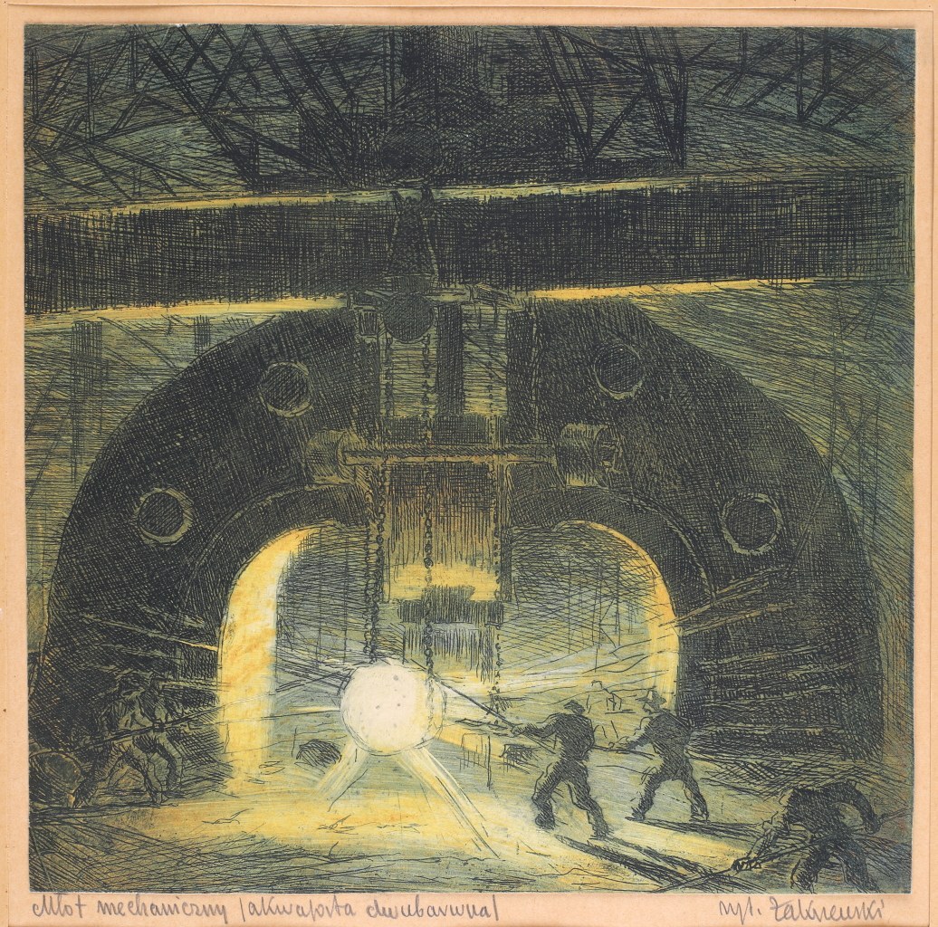 Akwaforta dwubarwna, papier; wym.: 235 x 238 mm; sygn. poniżej komp. p. d.: ryt. Zakrzewski; oł. l. d.: Młot mechaniczny /akwaforta dwubarwna/