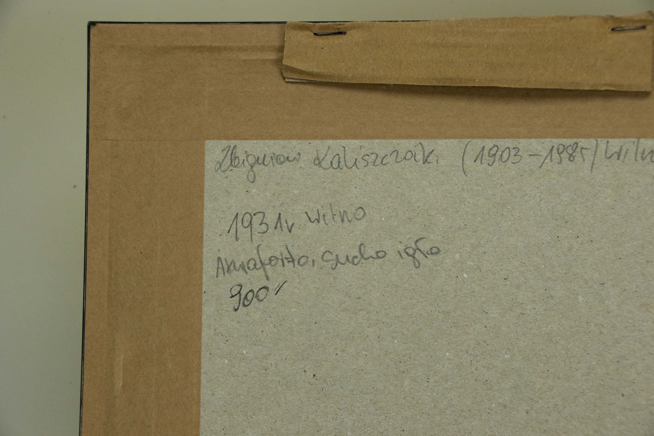 Zbigniew Kaliszczak (1903-1985)- grafik, malarz, rzeźbiarz. Studia na Wydziale Sztuk Pięknych Uniwersytetu Stefana Batorego ukończył w 1932 roku z odznaczeniem, grafikę w lipskiej Akademii Sztuki Graficznej. Chętnie eksperymentował, stosował rozmaite techniki: akwafortę, akwatintę, linoryt i przede wszystkim suchą igłę, w której to technice wydał trzy teki zatytułowane Wilno (1928-1931). Realistycznie odtwarzając ciekawsze zabytki Wilna - kościoły, ulice, zaułki i dziedzińce - Kaliszczak stosował ujęcia niekonwencjonalne. Pewną oschłość rysunku, narzuconą prawami techniki suchej igły, starał się złagodzić umiejętnie wprowadzając kolor.