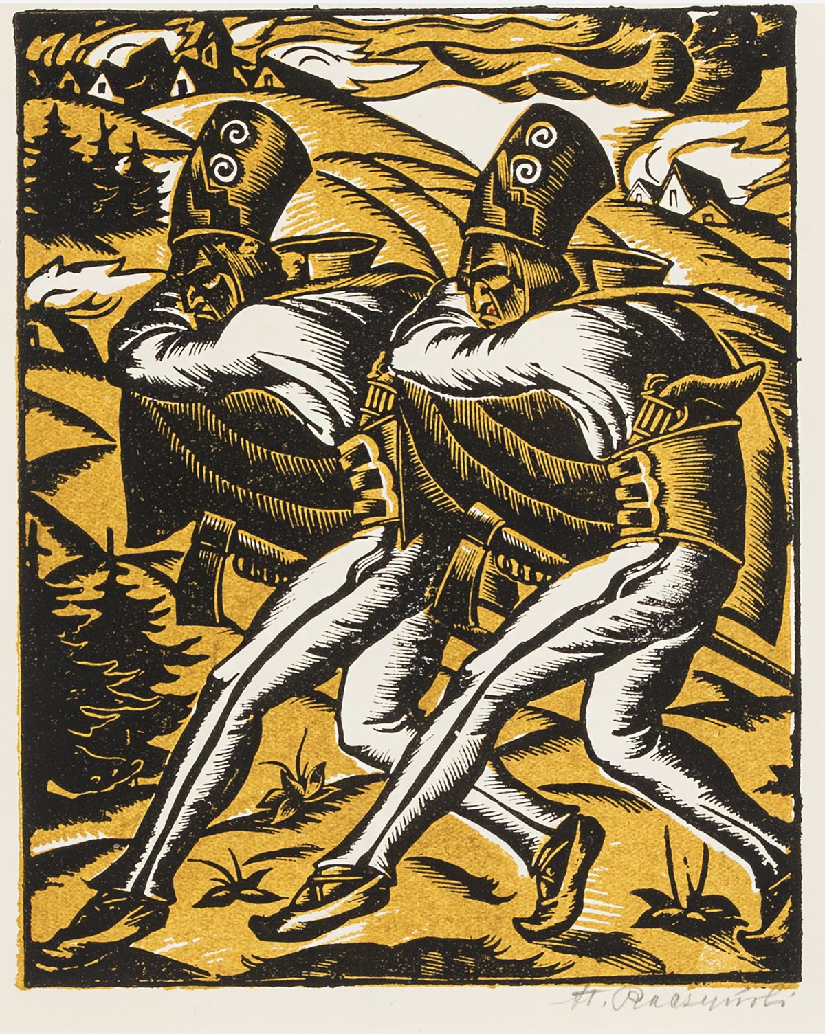 Drzeworyt barwny, papier; wym. odb.: 160 x 128 mm; sygn. oł. p. d.: "Zbójnicy".