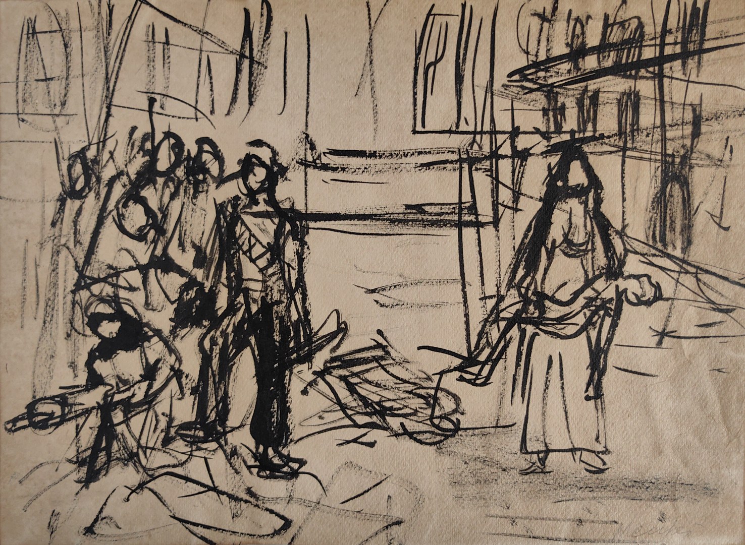 Prezentowana praca to przykład swobodnego szkicu tuszem, w którym artysta operuje dynamiczną, zdecydowaną kreską, budując scenę figuralną o dużej sile wyrazu. Zarys postaci i architektury potraktowany został syntetycznie, niemal kaligraficznie, co podkreśla spontaniczność i szkicowy charakter kompozycji.