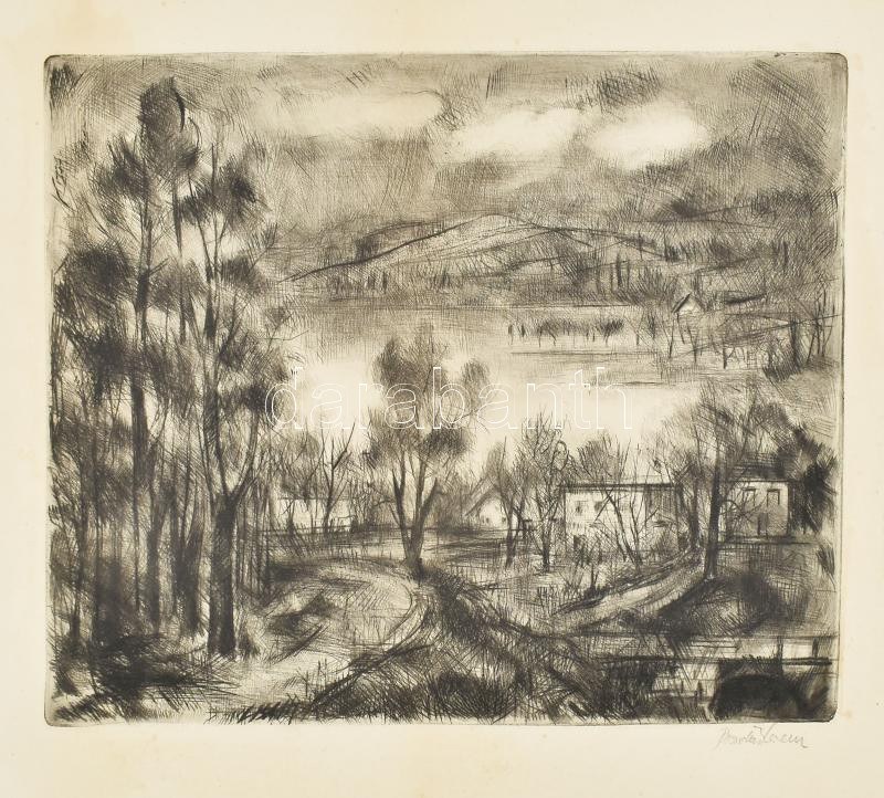 Bordás Ferenc (1911-1982): Táj. Rézkarc, papír, jelzett. Lap széle foltos. 24,5x29 cm
