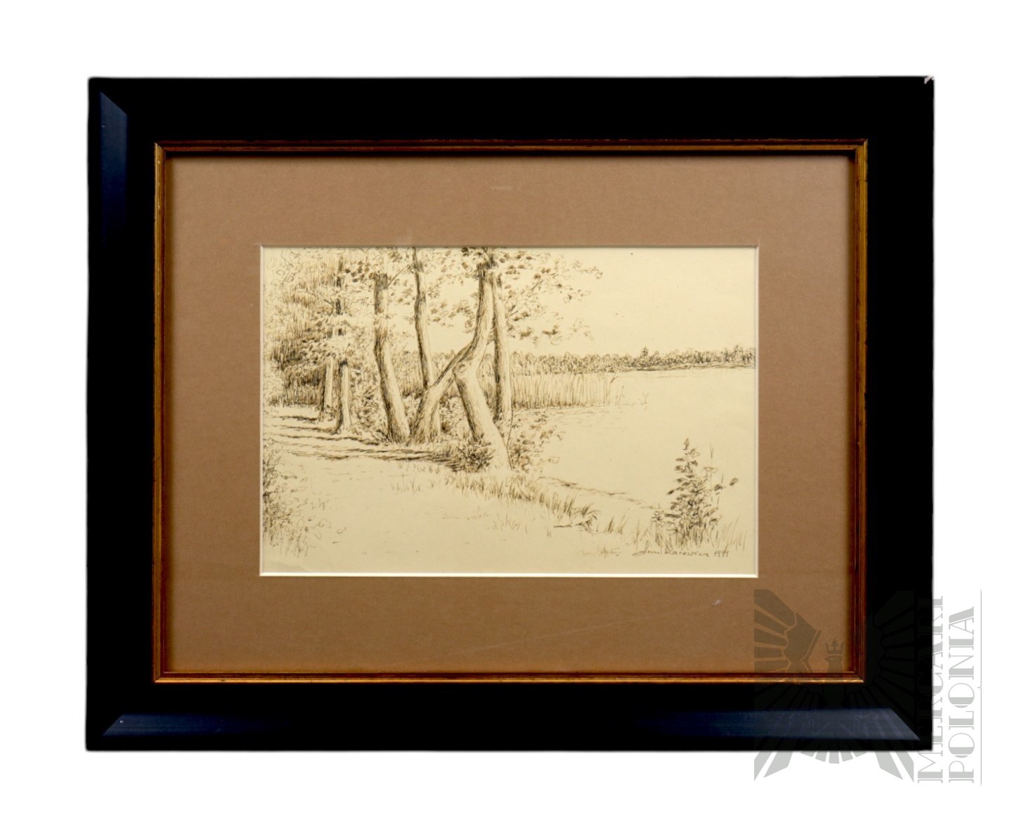 Obraz z rysunkiem w sepii autorstwa znanego aktora filmowego Emila Karewicza z 1991 r. Przedstawia brzeg jeziora lub stawu. Nie znamy ani jego tytułu ani miejsca jego powstania. Najprawdopodobniej został narysowany lub tylko podarowany na wakacjach w jednym z domów wczasowych dla przyjaciół z którymi aktor spędzał wówczas miło czas. Drugą pasją Emila Karewicza obok aktorstwa było właśnie malarstwo. Znalazło to odzwierciedlenie w zainteresowaniach syna artysty Krzysztofa, znanego malarza, symbolisty i kolorystyka. Rysował karykatury kolegów w teatrach, dorabiając przy tym do gaży aktorskiej. Wiele obrazów namalował z pamięci, m.in. pejzaże rodzinnego Wilna i okolic. Malował i rysował także w czasie wolnym w plenerze. Swoje prace kilkakrotnie wystawiał na wystawach w warszawskim Klubie Dowództwa Garnizonu, w Akademii Obrony Narodowej w Rembertowie, w Łódzkim Domu Kultury i w zamku w Nidzicy.Wymiary z ramą: 48,1 cm x 38,5 cmW świetle passpartout: 28,7 cm x 19 cm