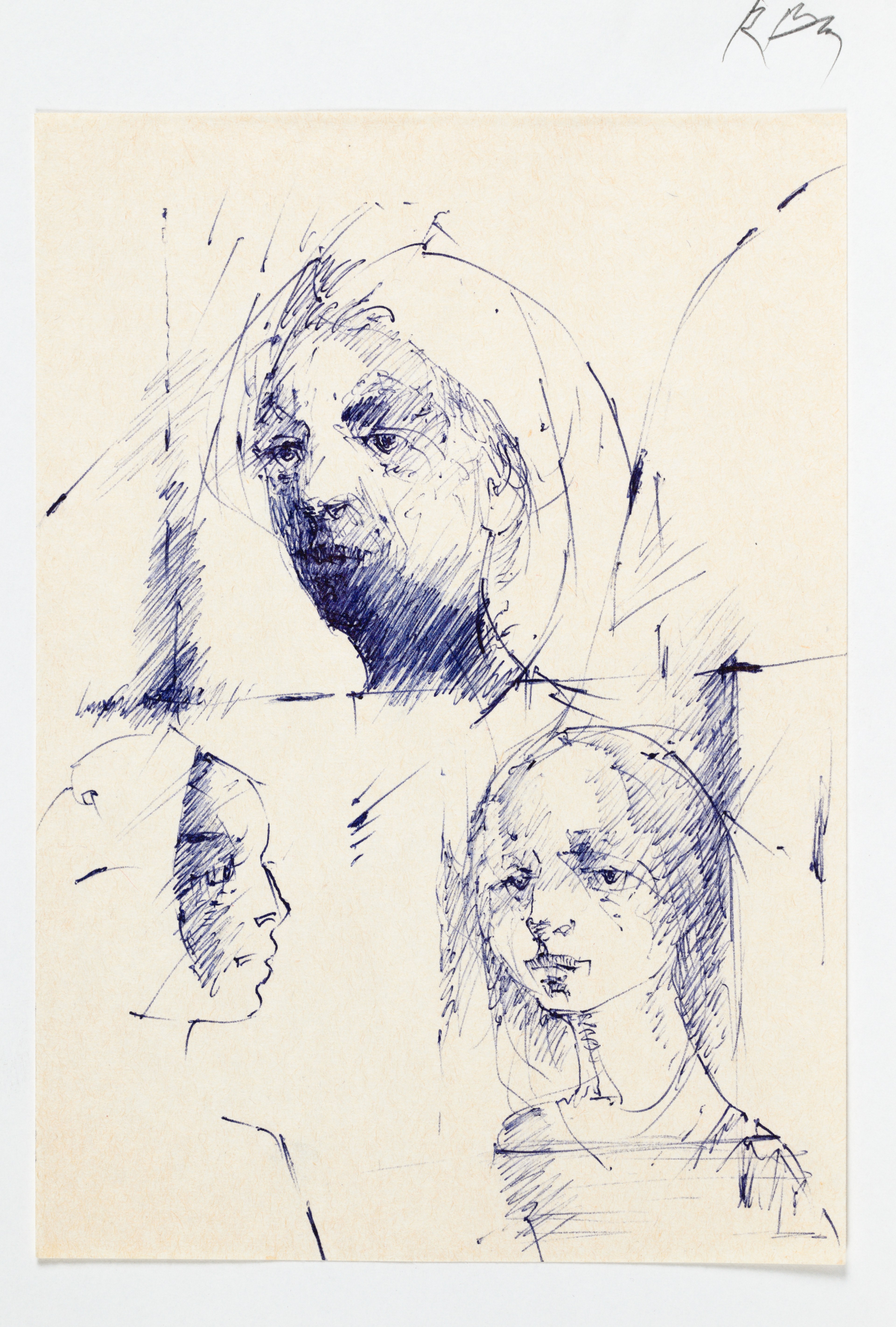 długopis, papier kremowy naklejony na papier; 20,5 x 14,3 cm (wymiar arkusza z rysunkiem);