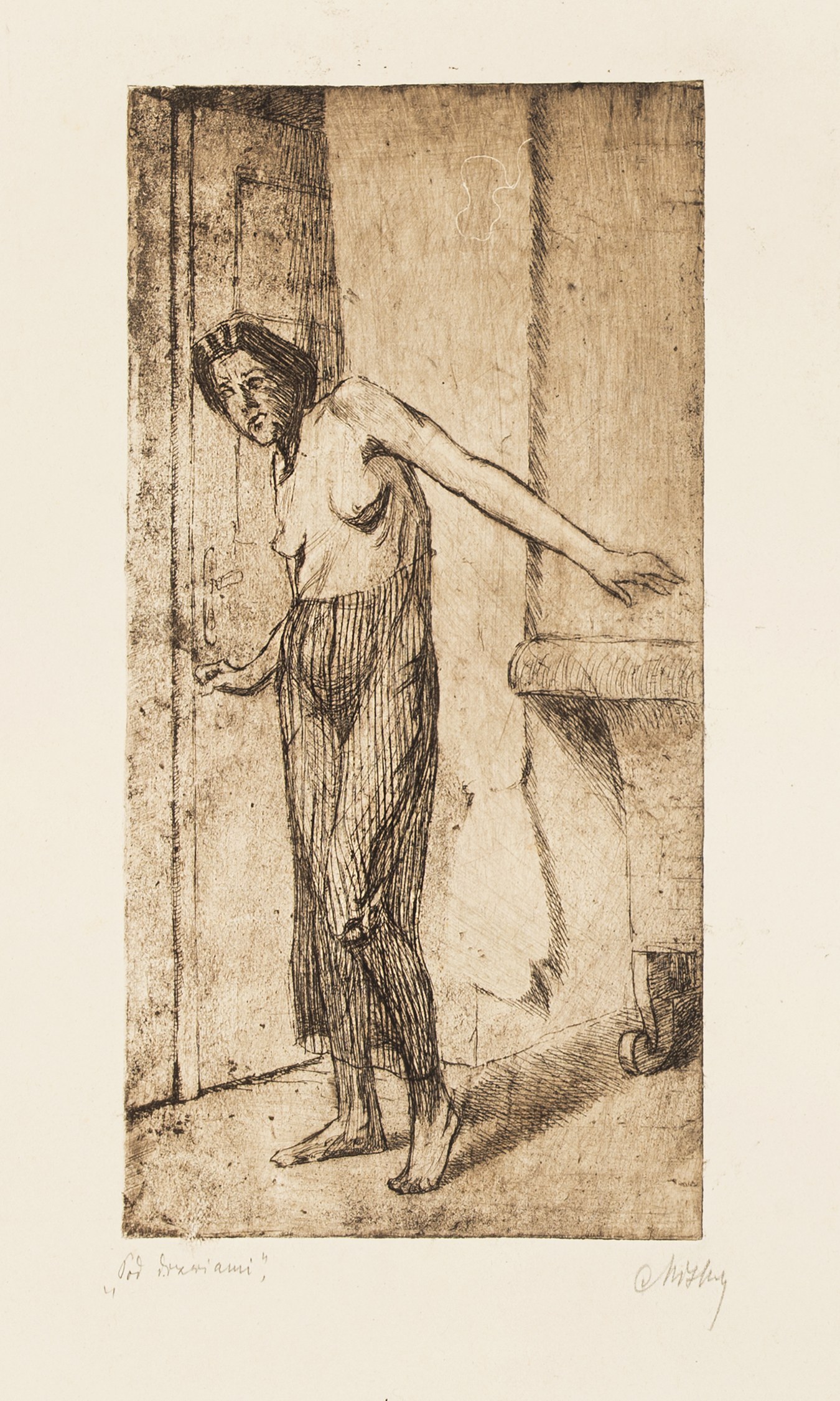 Akwaforta, papier; wym. odb.: 212 x 108 mm; sygn. oł. p.d.: "Misky"; oł. l. d.: "Pod drzwiami"