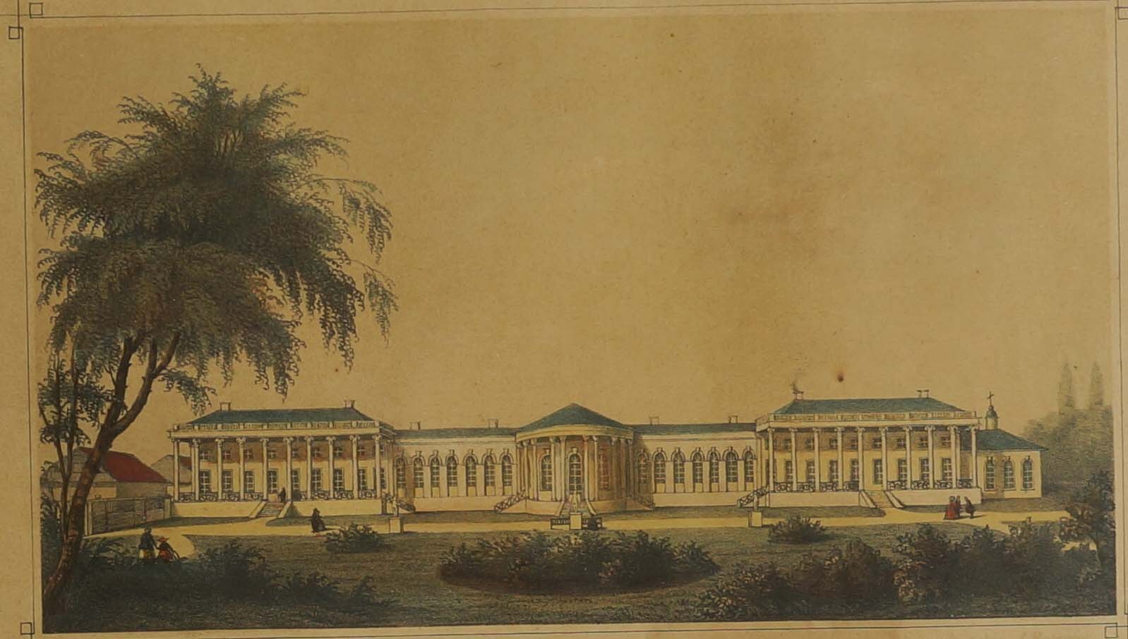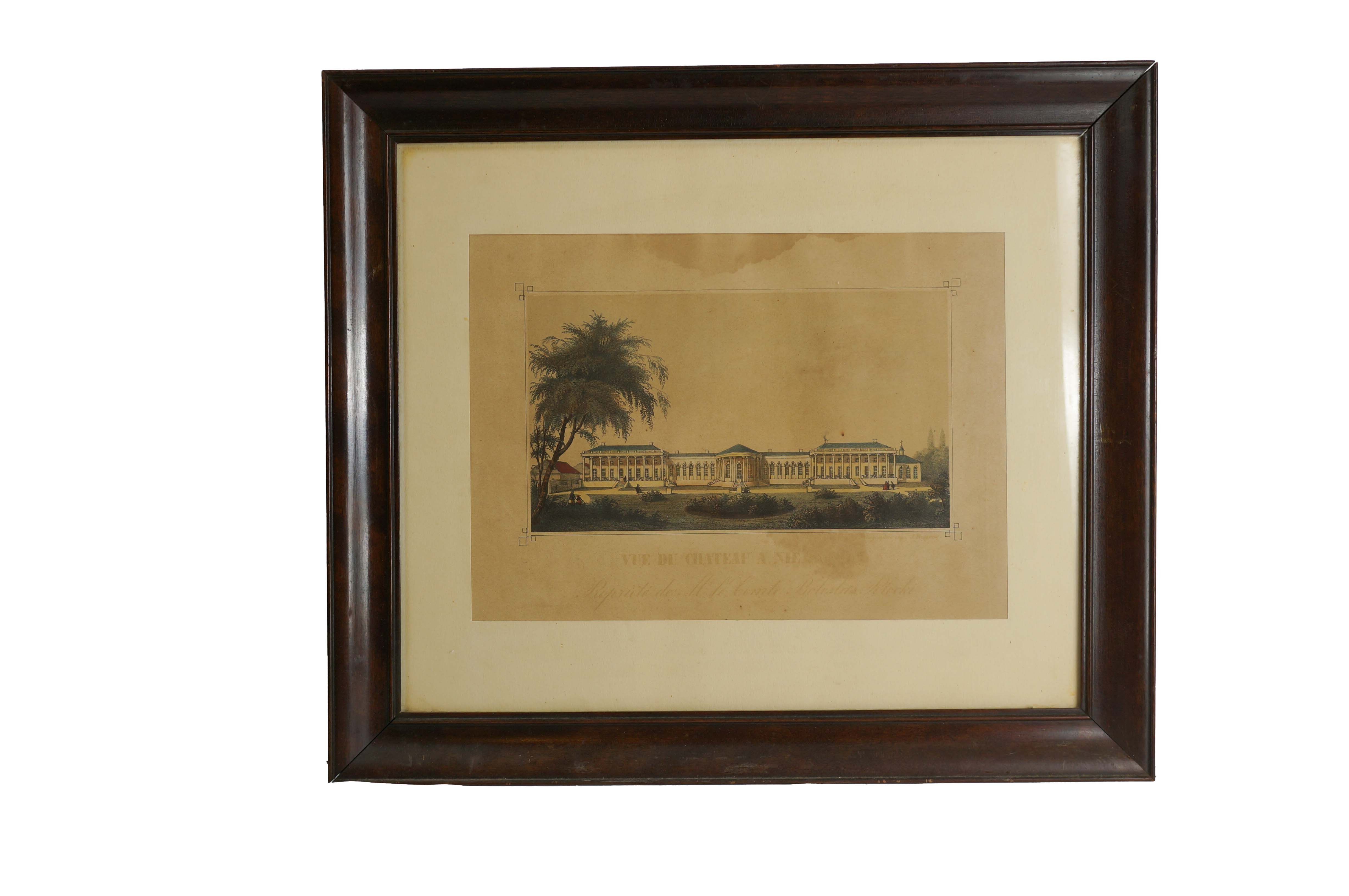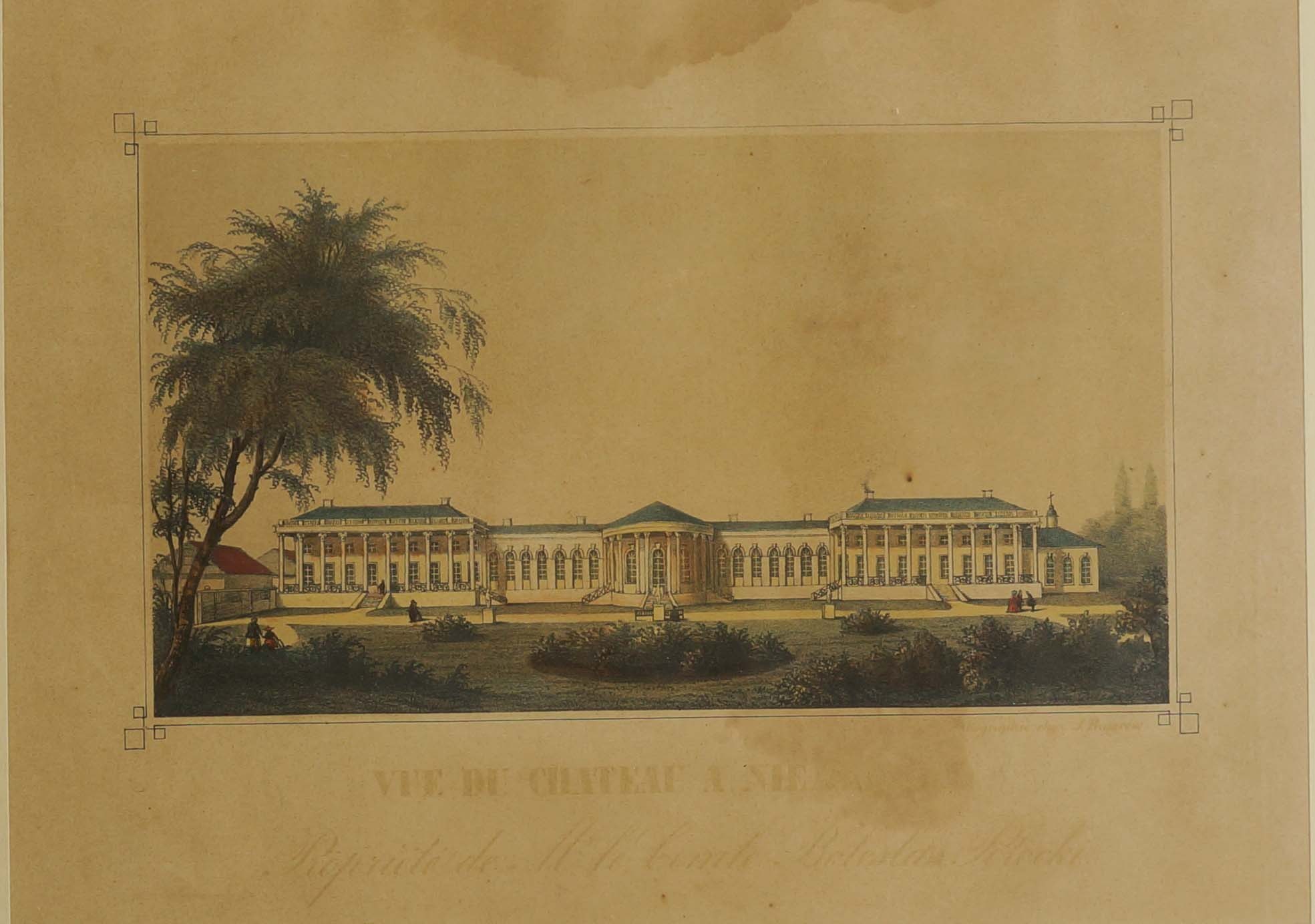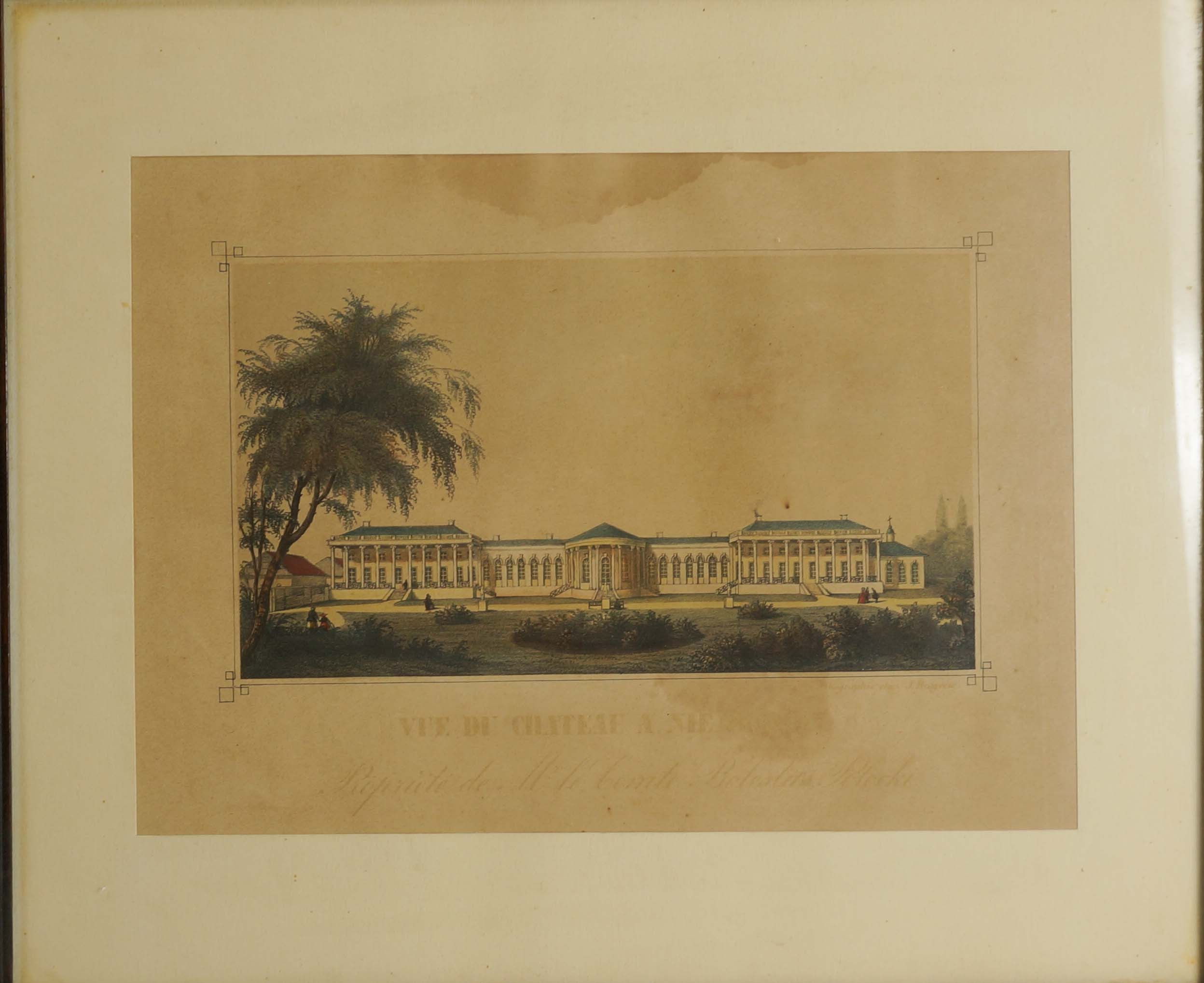 Pałac Potockich w Niemirowie. Posiadłość Bolesława Potockiego / Vue du chateau Niemirów. Propriete de la Comte Boleslau Potocki, litografia barwna, XIX wiek, sygnowana w prawym, dolnym narożniku pod kompozycją: Litographie J.H [nieczytelne], f. 29,5x21,5cm w świetle passe-partout, 45x39cm całość, RZADKIE