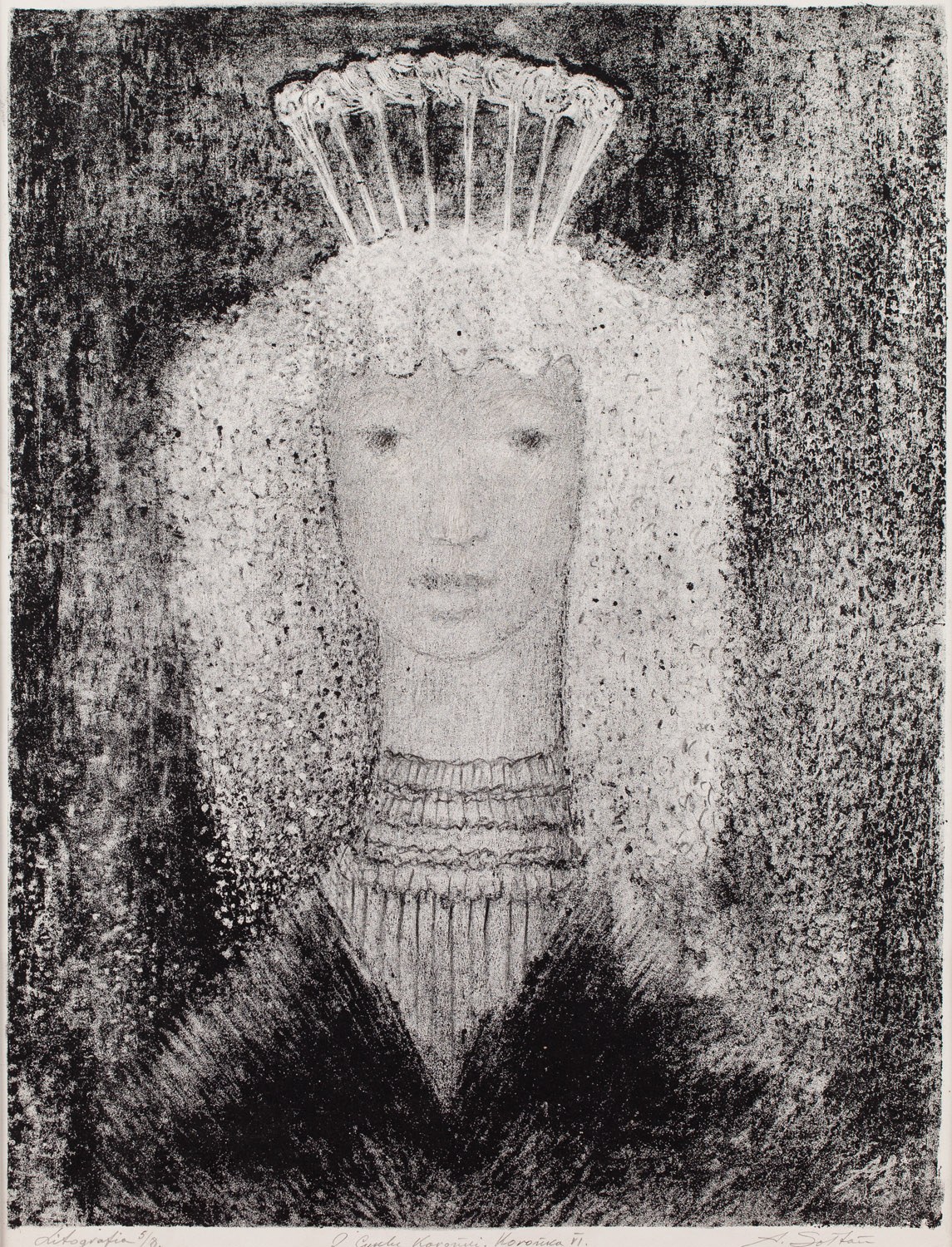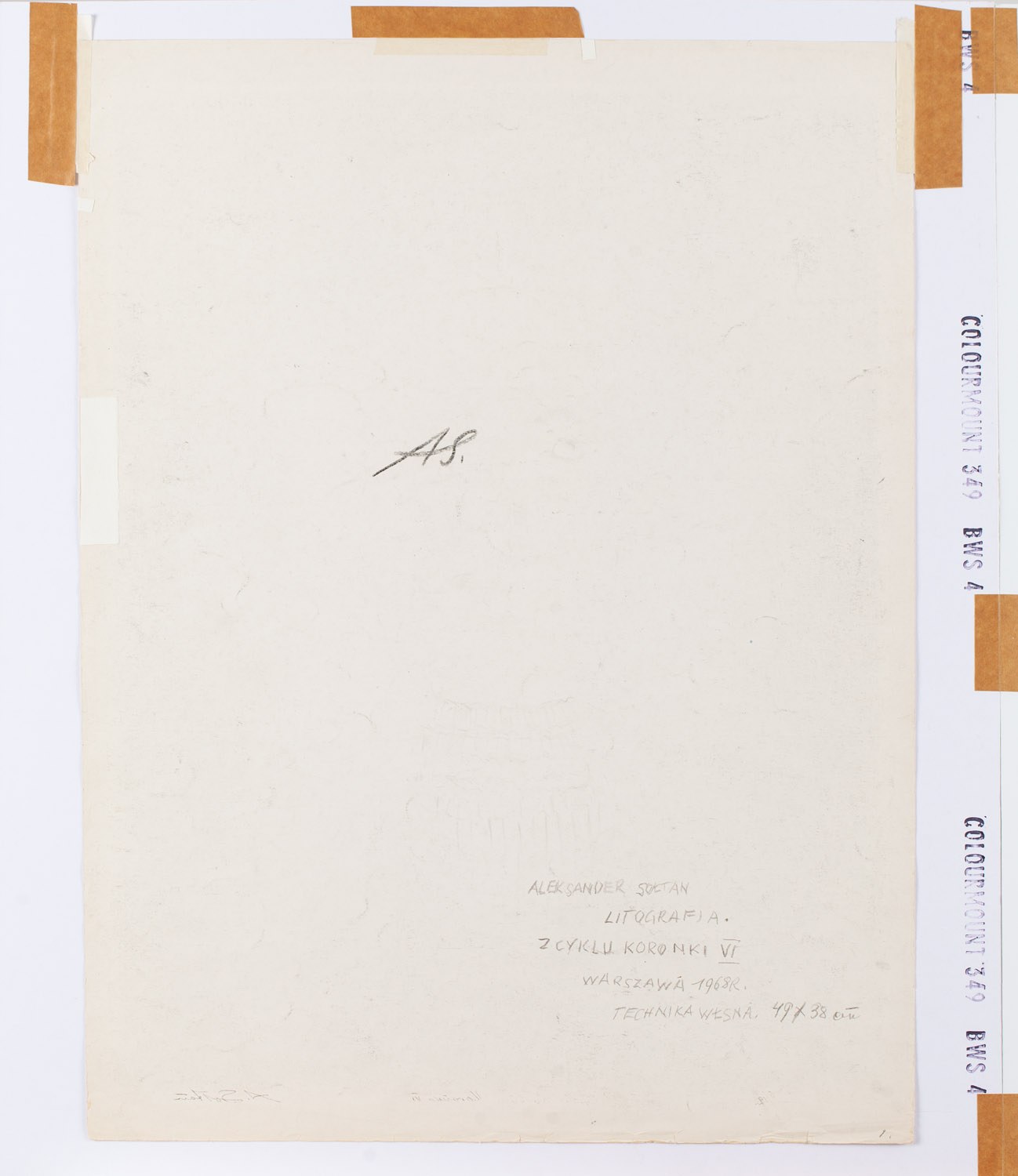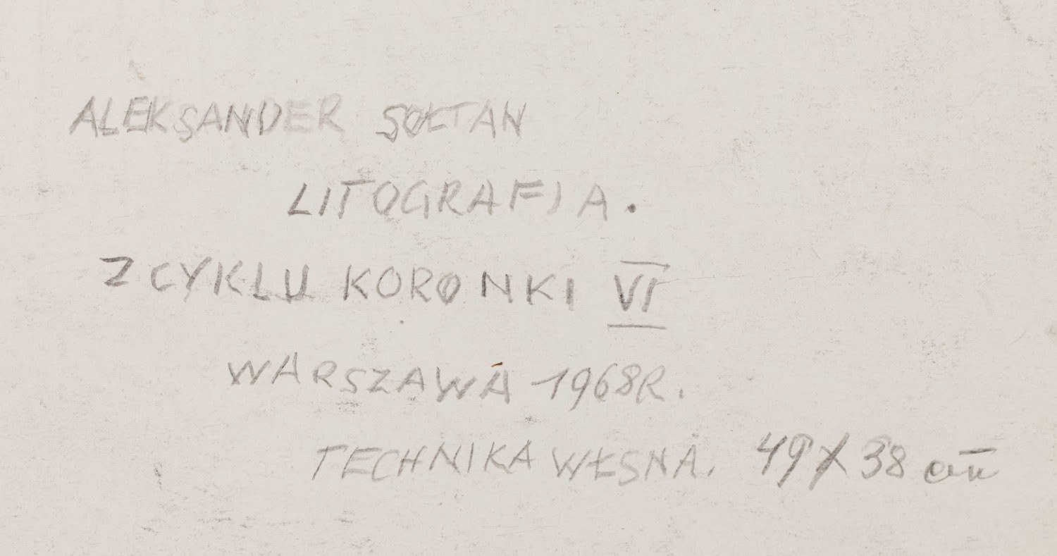 na odwrociu opisany: 'ALEKSANDER SOŁTAN | LITOGRAFIA | Z CYKLU KORONKI VI | WARSZAWA 1968R. | TECHNIKA WŁASNA | 49 X 38 CM'