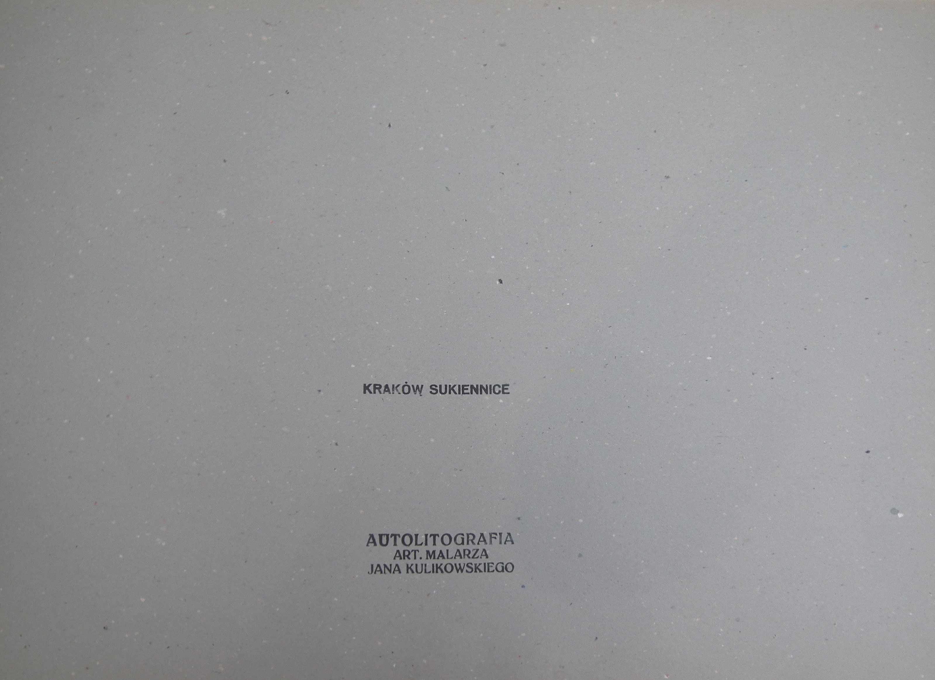 Autolitografia z Teki Krakowskiej, papier 64 x 55 cm na podkładzie kartonowym 70 x 50 cm, sygn. na płycie p.d. monogram wiązany oraz odręcznie w kompozycji śr.d. . Na odwrociu autorskie pieczęcie artysty „KRAKÓW ULICA FLORIAŃSKA” oraz „AUTOLITOGRAFIA ART.MALARZA JANA KULIKOWSKIEGO”