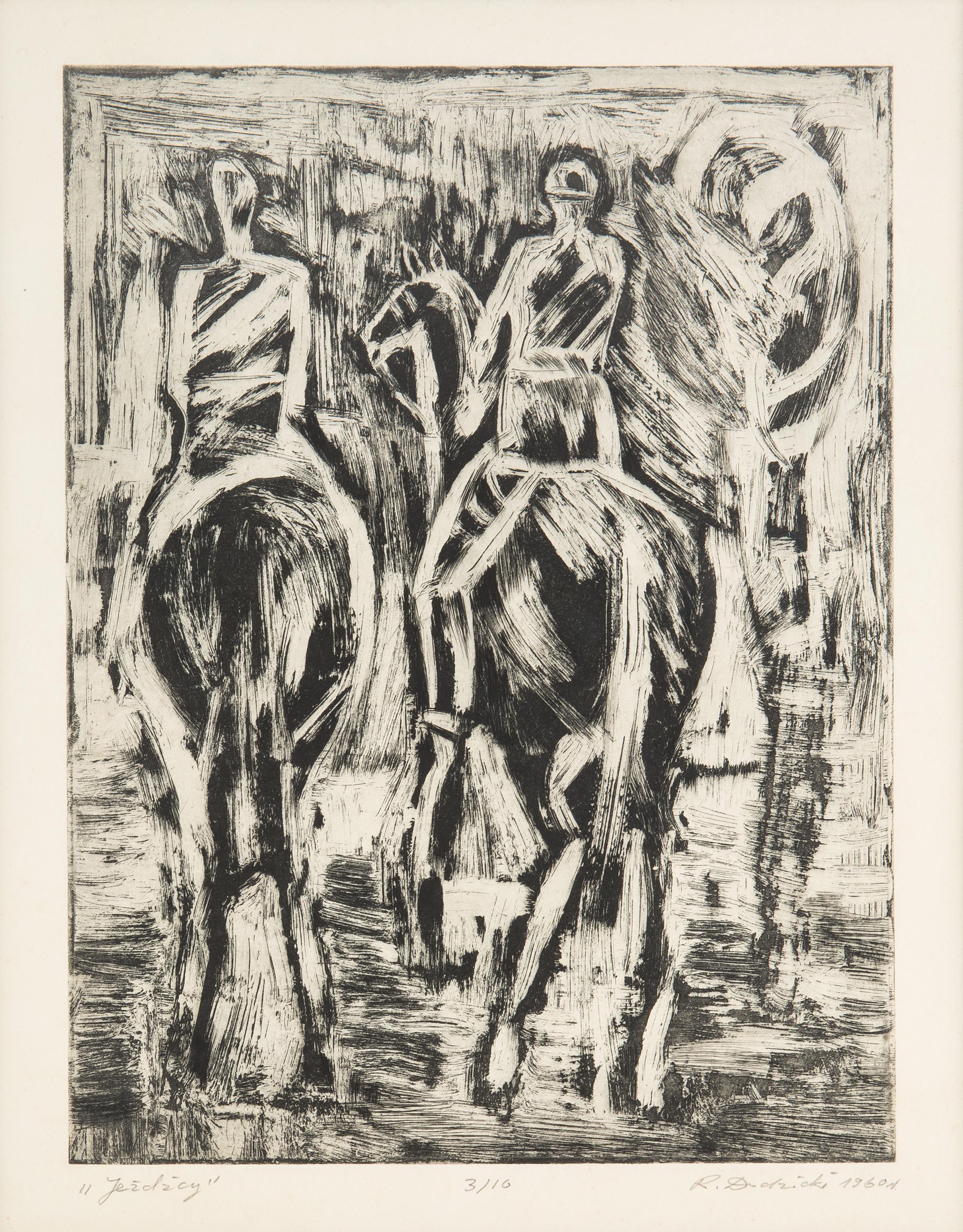 akwaforta, papier, 32 x 24 cm (zdruk), sygn. i dat. p.d.: R. Dudzicki 1960 r., opisany l.d.: Jeźdźcy, śr.d.: 3/10