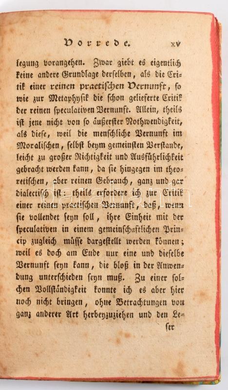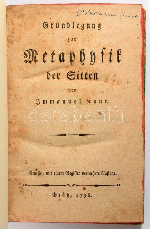 Kant, Immanuel.: Grundlegung zur Metaphysik der Sitten. Neueste, mit einem Register vermehrte Auflage. Grätz, 1796. XVIII, 146 p., 10 lev. Modern félvászon kötésben. Kant munkájának 3. kiadása. .