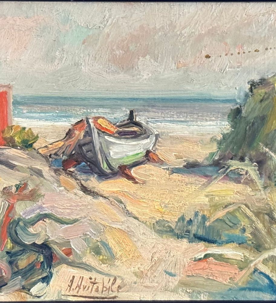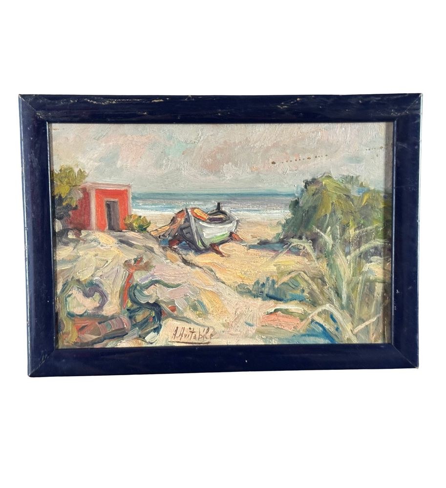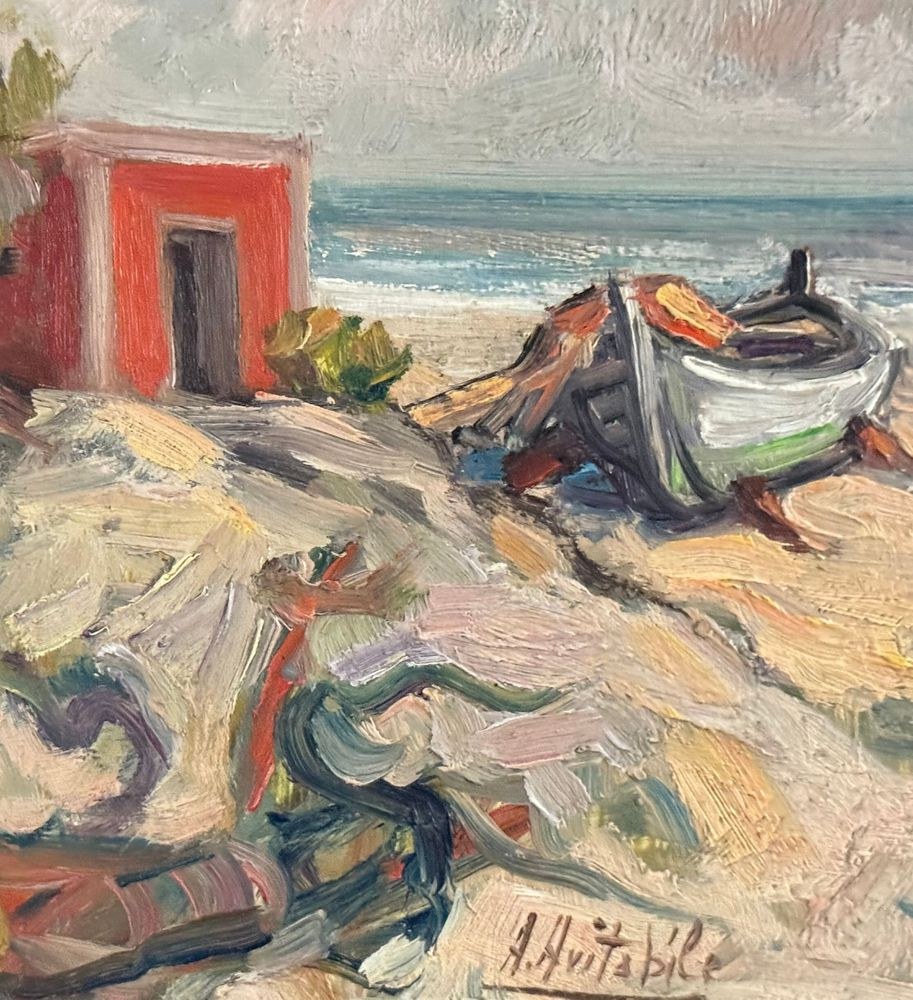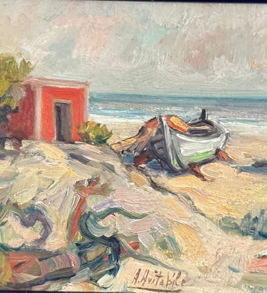 Oil painting on panel, 20th century, Italian school, depicting a seaside view with a beached boat. Dimensions including frame: 33.5x24 cm. Inner frame dimensions: 30x20 cm. Signed at the bottom center A. Avitabile. Work in good condition.