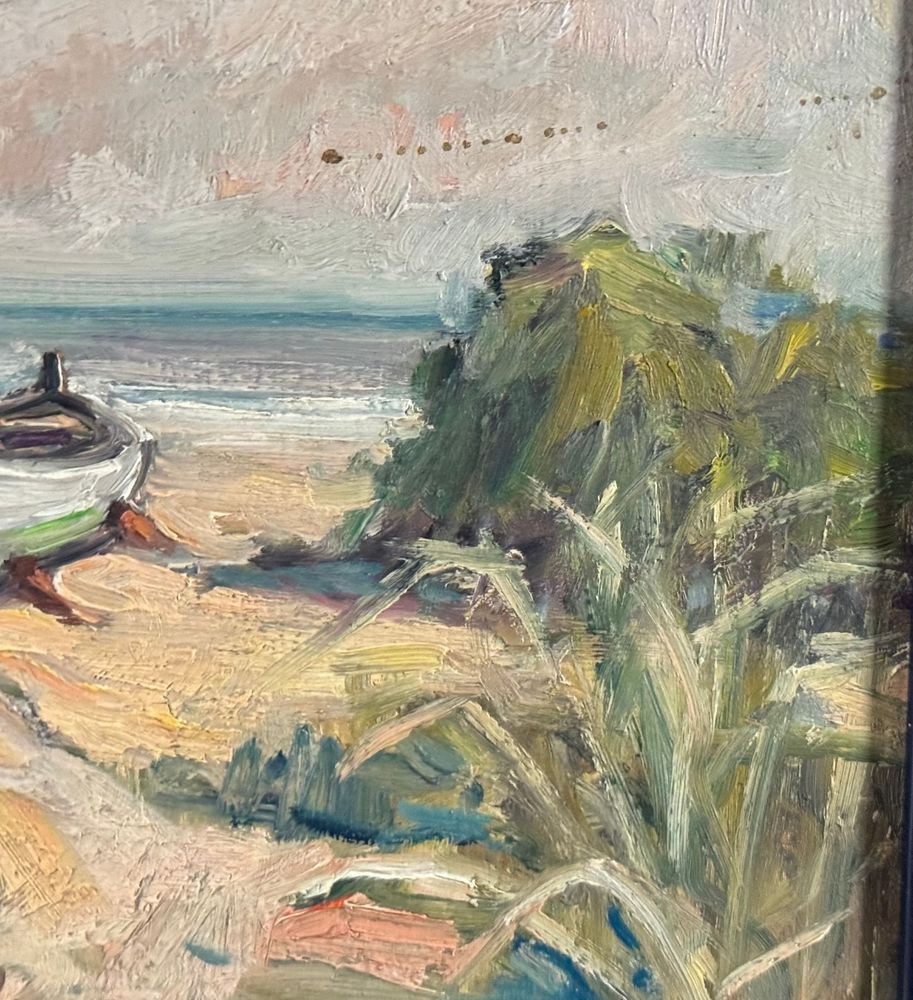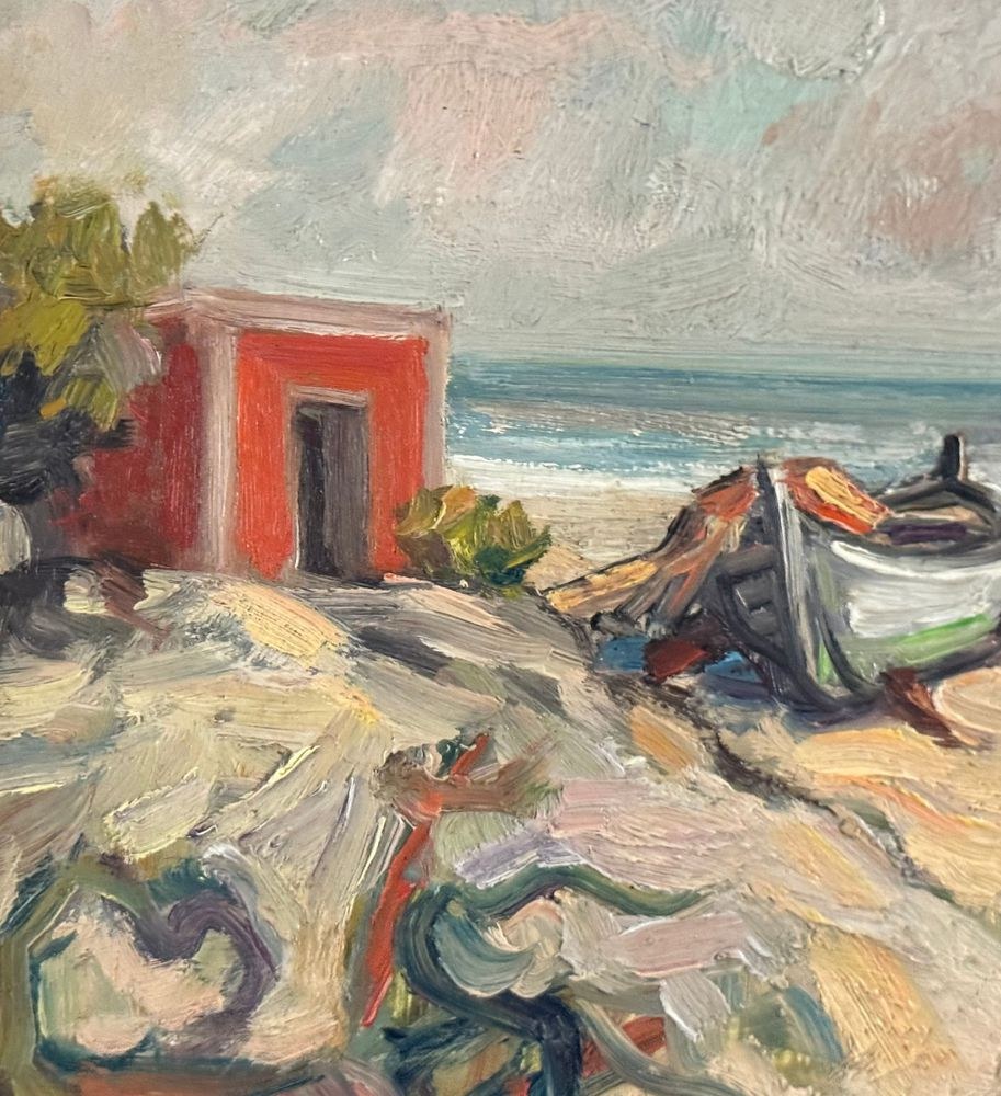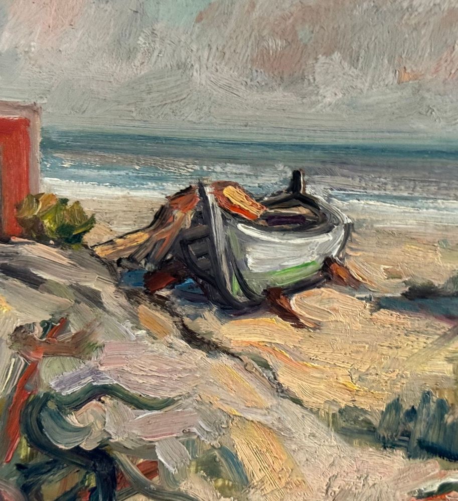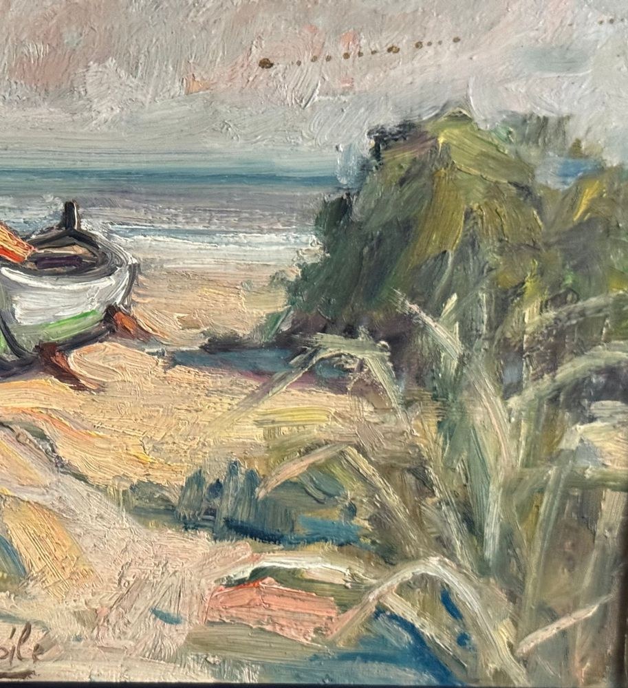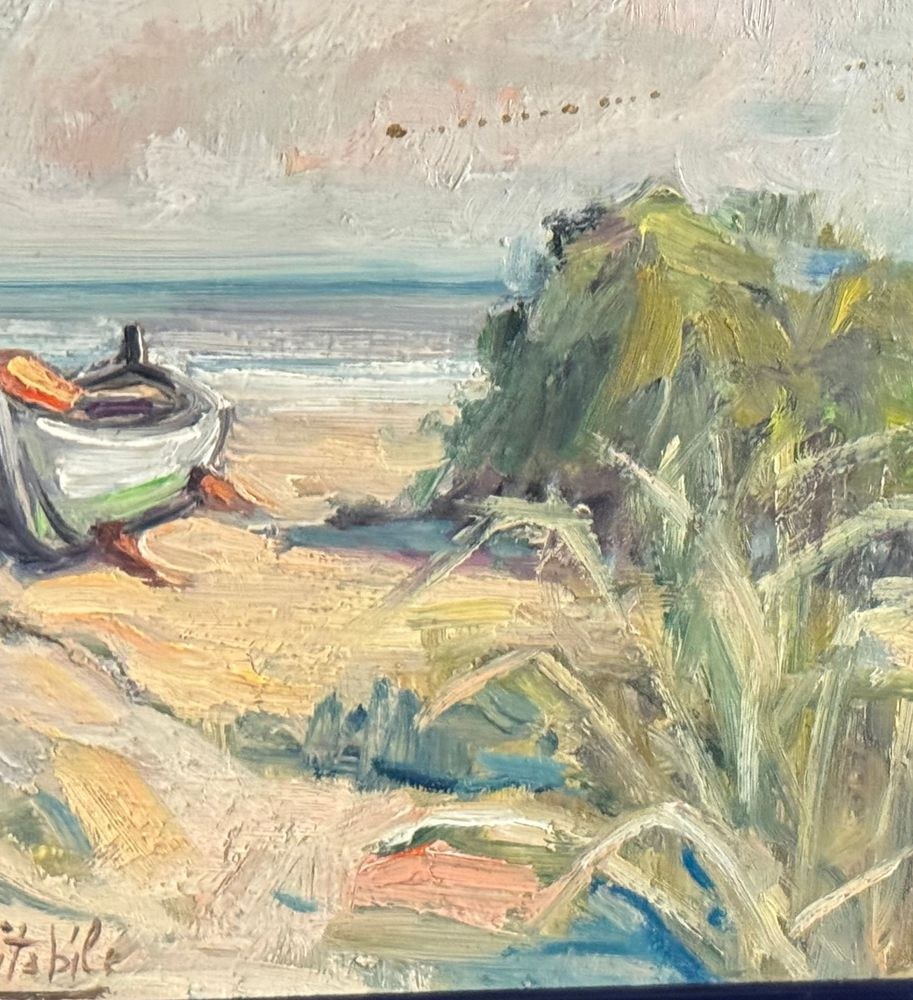 Oil painting on panel, 20th century, Italian school, depicting a seaside view with a beached boat. Dimensions including frame: 33.5x24 cm. Inner frame dimensions: 30x20 cm. Signed at the bottom center A. Avitabile. Work in good condition.