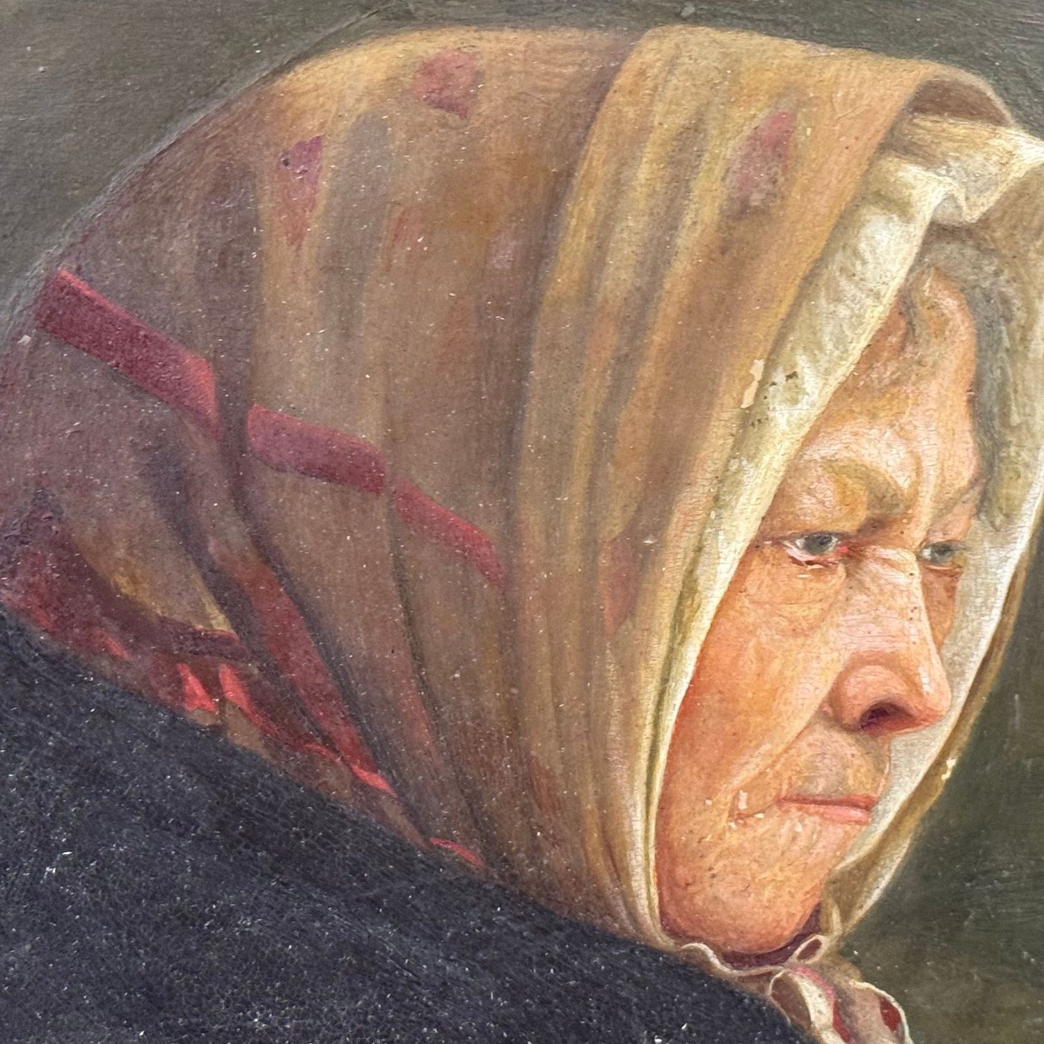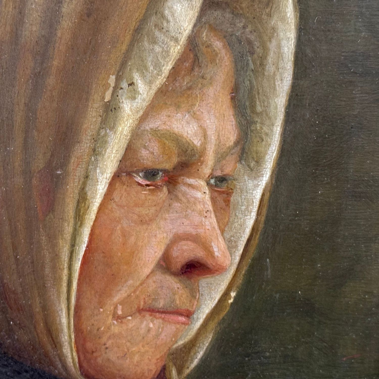 Oil painting on wood panel, 19th/20th century, Italian school, depicting Portrait of an Elderly Woman with a Cloak.