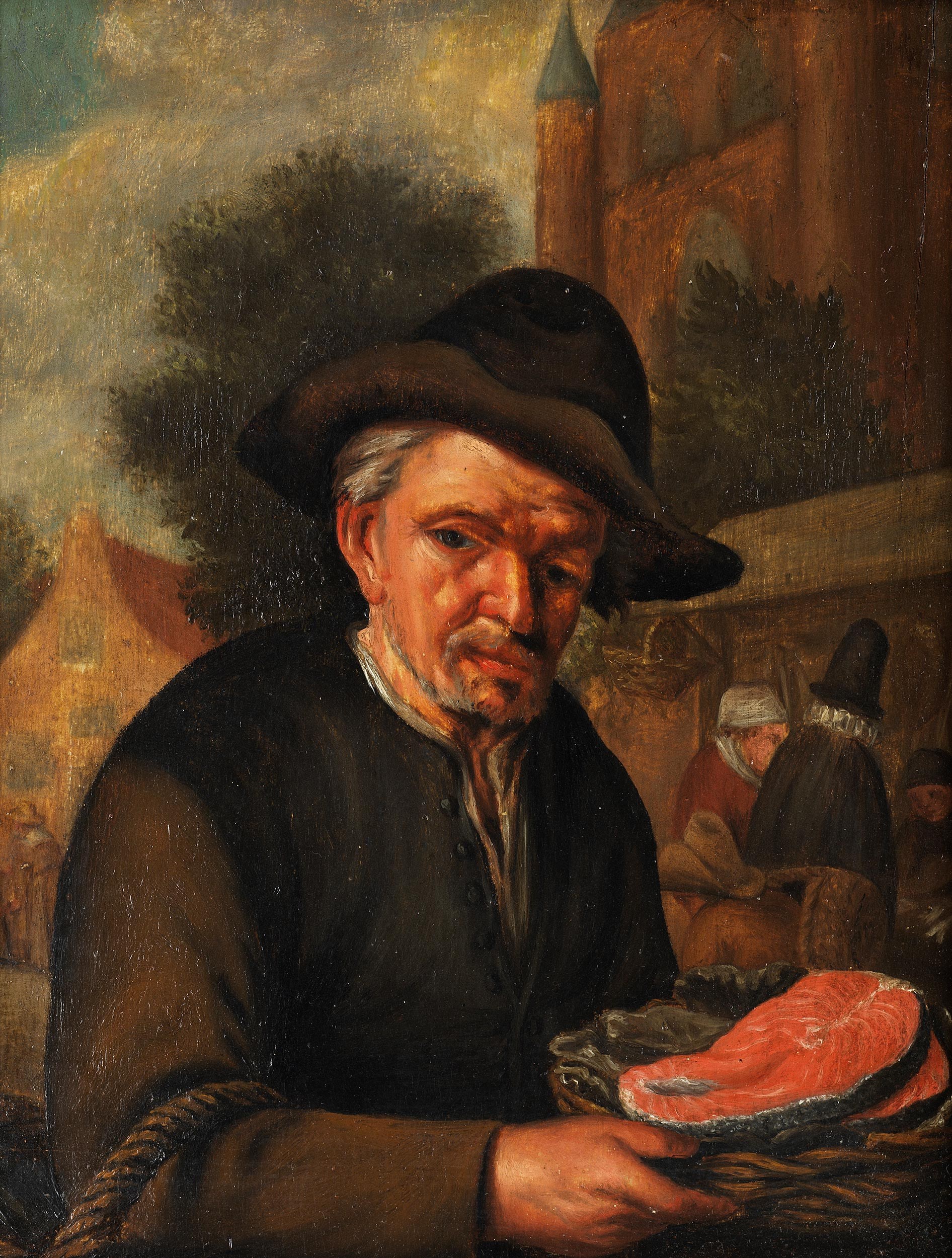 Vor einer Kirche mit flankierenden Westwerktürmen die Halbfigur eines Mannes vor einigen Marktständen einen Korb mit aufgeschnittenem Fisch zeigend. (1411283) (13)