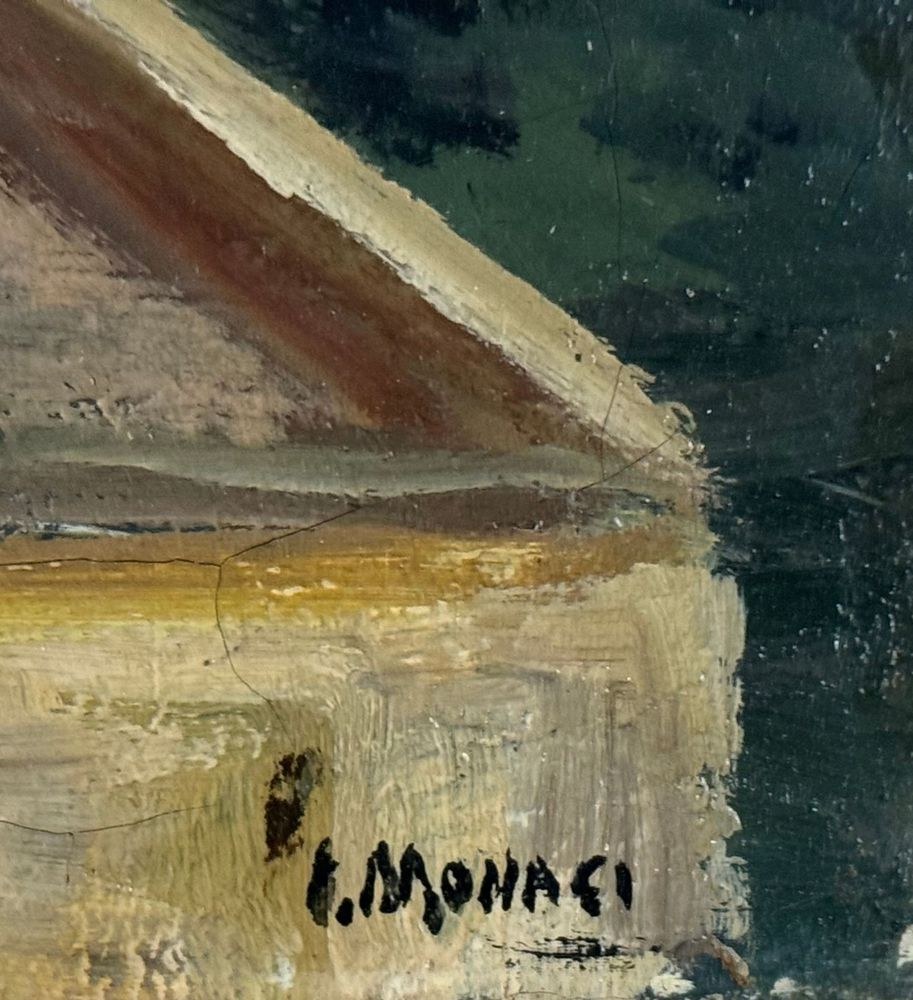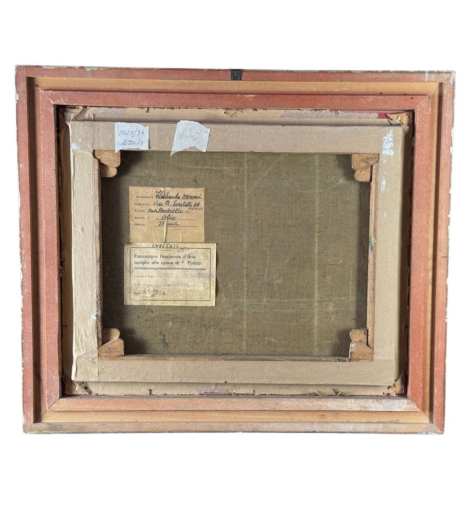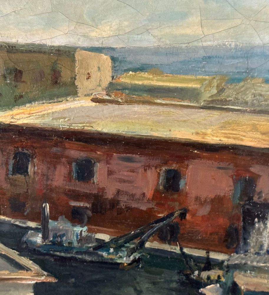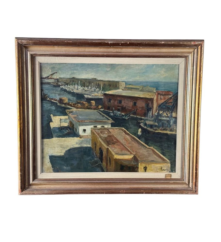 Oil on canvas painting, 20th century period, Italian school, depicting Molo Beverello (Naples). Dimensions including frame: 66x56 cm. Dimensions without frame: 50x40 cm. Signed in the lower right corner and authenticated on the back by Aleardo Monaci. The work is in good condition.