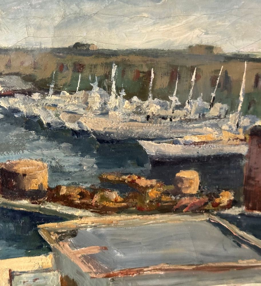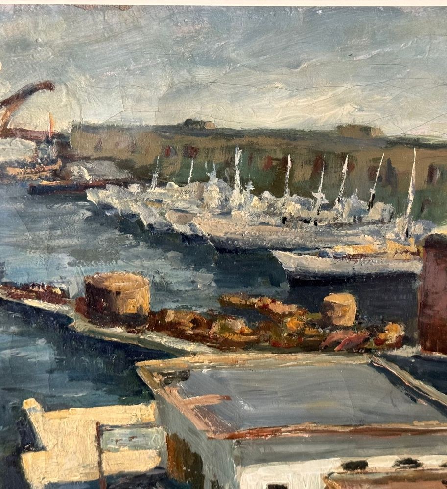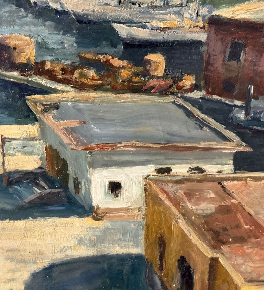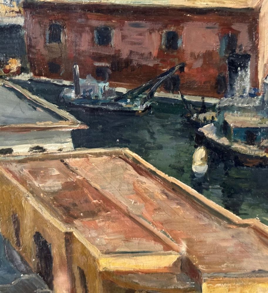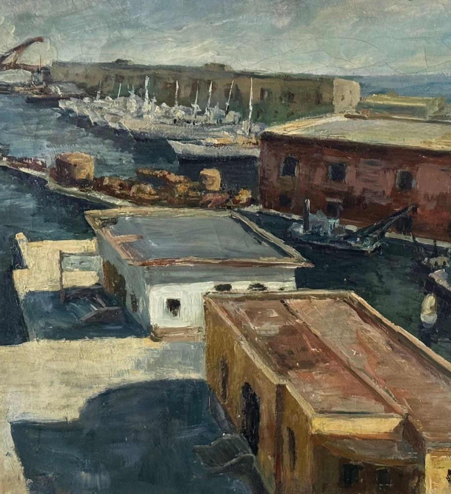 Oil on canvas painting, 20th century period, Italian school, depicting Molo Beverello (Naples). Dimensions including frame: 66x56 cm. Dimensions without frame: 50x40 cm. Signed in the lower right corner and authenticated on the back by Aleardo Monaci. The work is in good condition.