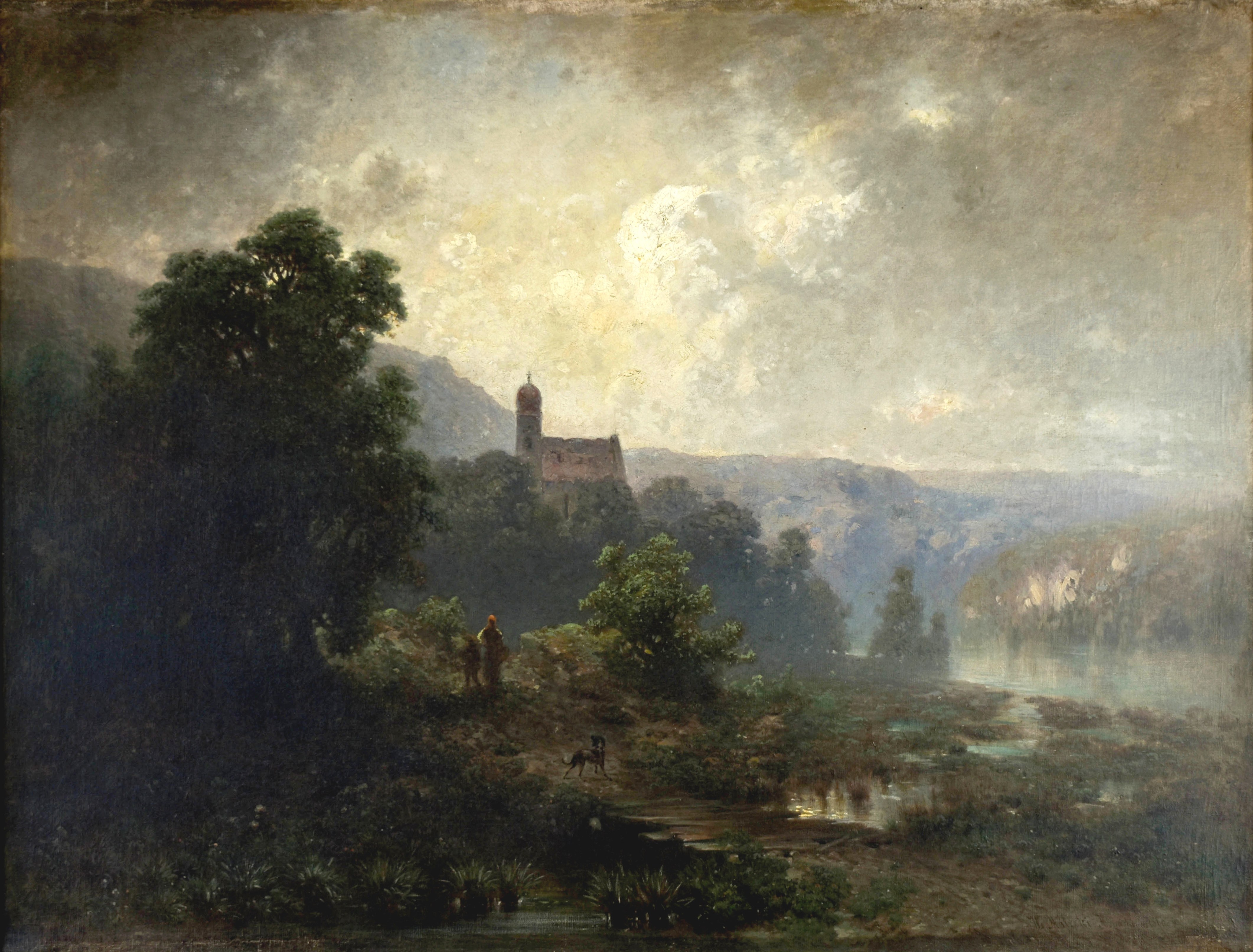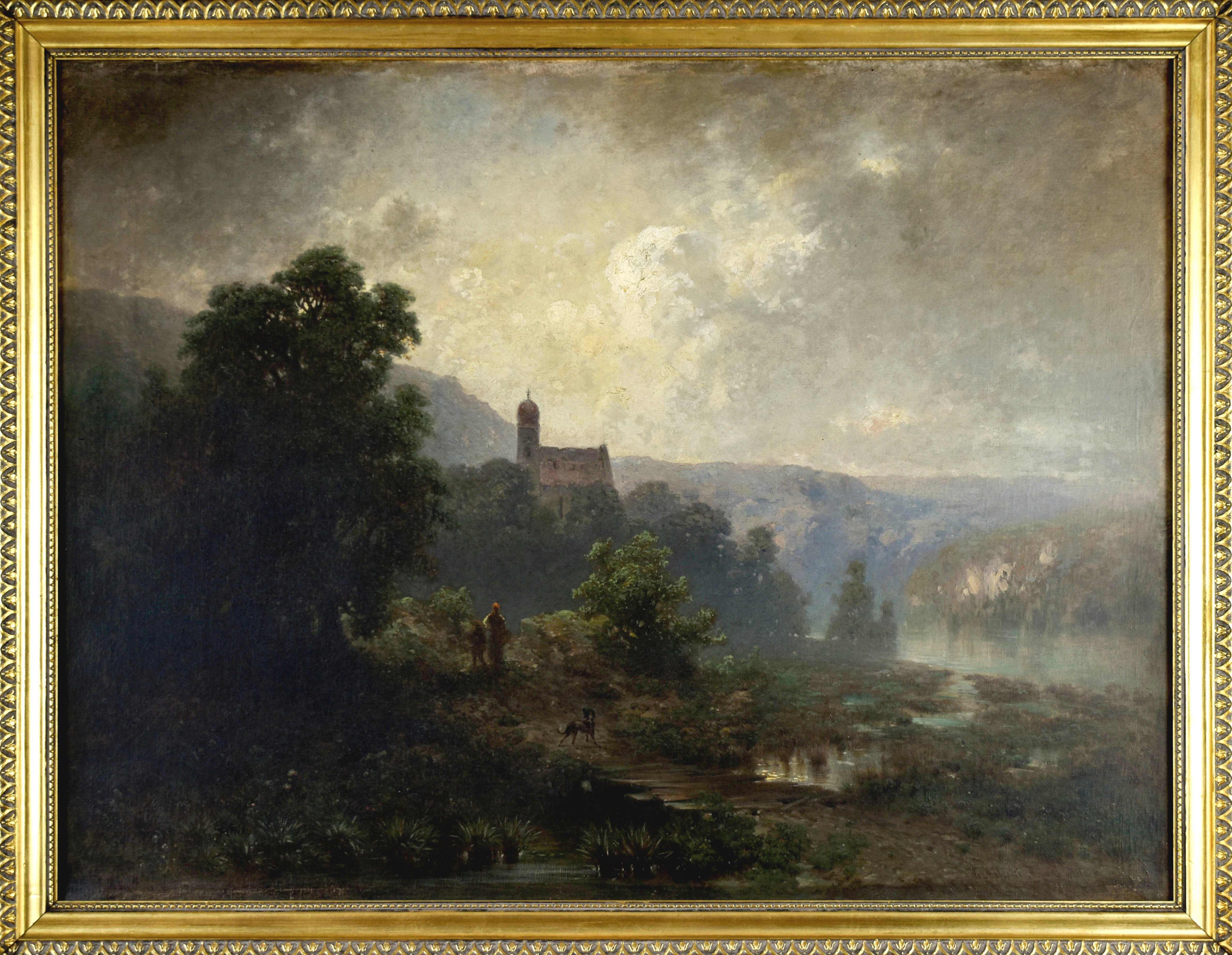„W roku 1869 kończy się pierwszy okres monachijski Władysława Maleckiego, trudno jednak ustalić, kiedy przybywa on do kraju, rozpoczynając drugi okres polski, krótki, bo trwający ledwie ponad rok. Wyznacznikami mogą tu być dwa obrazy olejne, które powstały w tym właśnie roku. Są nimi: „Krajobraz górski”, kat. 3, (znany też jako „Krajobraz z sylwetą kościoła” – pierwotny tytuł „Krajobraz z okolic Monachium”) oraz „Krajobraz z okolic Buska”. Ponieważ ten ostatni wystawiany był w lipcu na wystawie w Monachium, można przyjąć, że Malecki już w drugim kwartale 1869 roku znalazł się w Polsce, a zatem „Krajobraz górski” namalował jeszcze przed przyjazdem do kraju. (…) Refleksyjna zaduma emanująca z pejzażu, tchnącego jeszcze romantyczną nutą, pogłębiona została ciężkimi, szarymi przedburzowymi chmurami, spowijającymi rozmazany zarys gór i odcinającą się na tym tle sylwetą kościoła. Nieco wyraźniej ukazane zostały namalowane w tonacji brązów i zieleni pierwszoplanowe drzewa i podmokła ziemia, w prawej części obrazu widoczny jest wąwóz rzeki okalającej porośnięte wzniesienie z kościołem. Obraz ten osadzony jest silnie w nurcie monachijskiego malarstwa pejzażowego, reprezentowanego przez Eduard Schleicha i Adolfa Heinricha Liera.” A.Oborny „Poeta pejzażu”, [w:] Władysław Aleksander Malecki 1836–1900, Kielce 1999, s. 28.