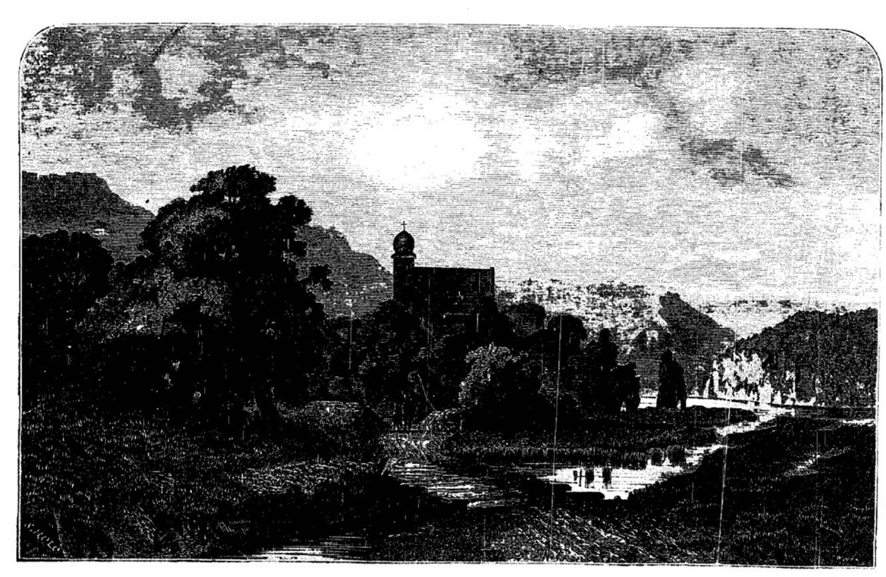 Wiadomo, że „Krajobraz górski” (pod tytułem „Krajobraz z okolic Monachium”) był wystawiany na Wystawie Obrazów w Towarzystwie Zachęty Sztuk Pięknych w Królestwie Polskim i reprodukowany pod postacią ryciny w tygodniku „Kłosy” w 1870 roku (nr 256, s.317 zob. ilustr.). Porównując rycinę z obiema wersjami obrazu — tą z Muzeum Narodowego w Warszawie i omawianą – trudno jednoznacznie określić, na podstawie, której wersji została ona stworzona, a co za tym idzie, która z prac była prezentowana na wystawie. Sposób ukazania szczególnie kościółka, proporcje jego wieży i kopułka, na rycinie mogłyby wskazywać, że pierwowzorem byt jednak omawiany, nieznany dotąd obraz, a nie jak sądzono jego mniejsza, warszawska wersja.”