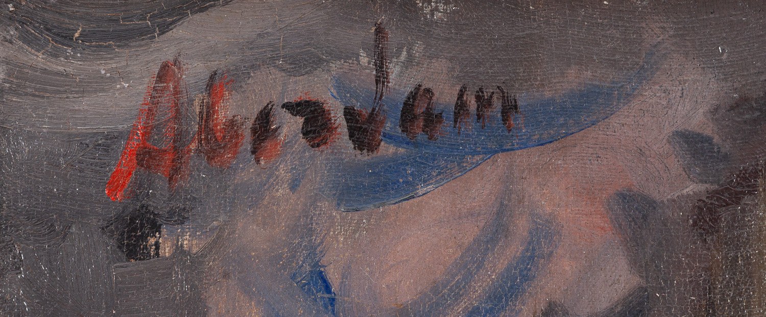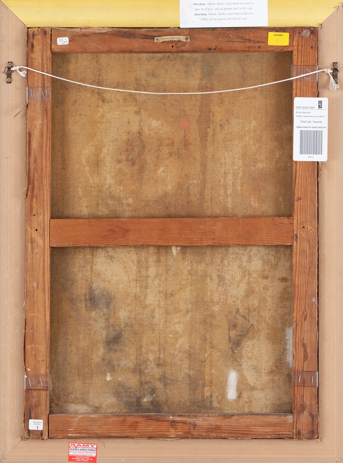 na krośnie malarskim nalepki aukcyjne, na ramie papierowa nalepka wystawowa oraz nalepka pracowni ramiarskiej