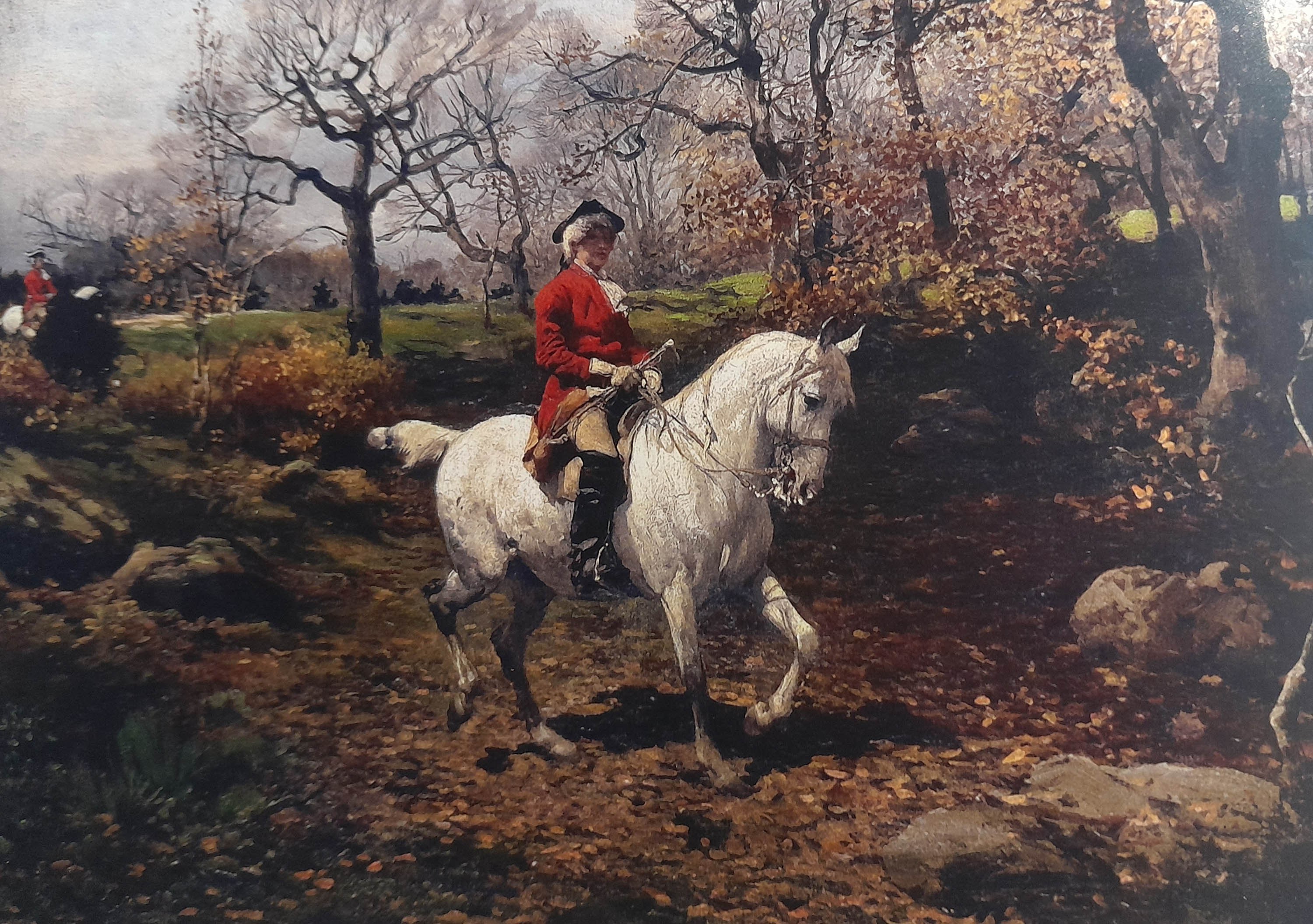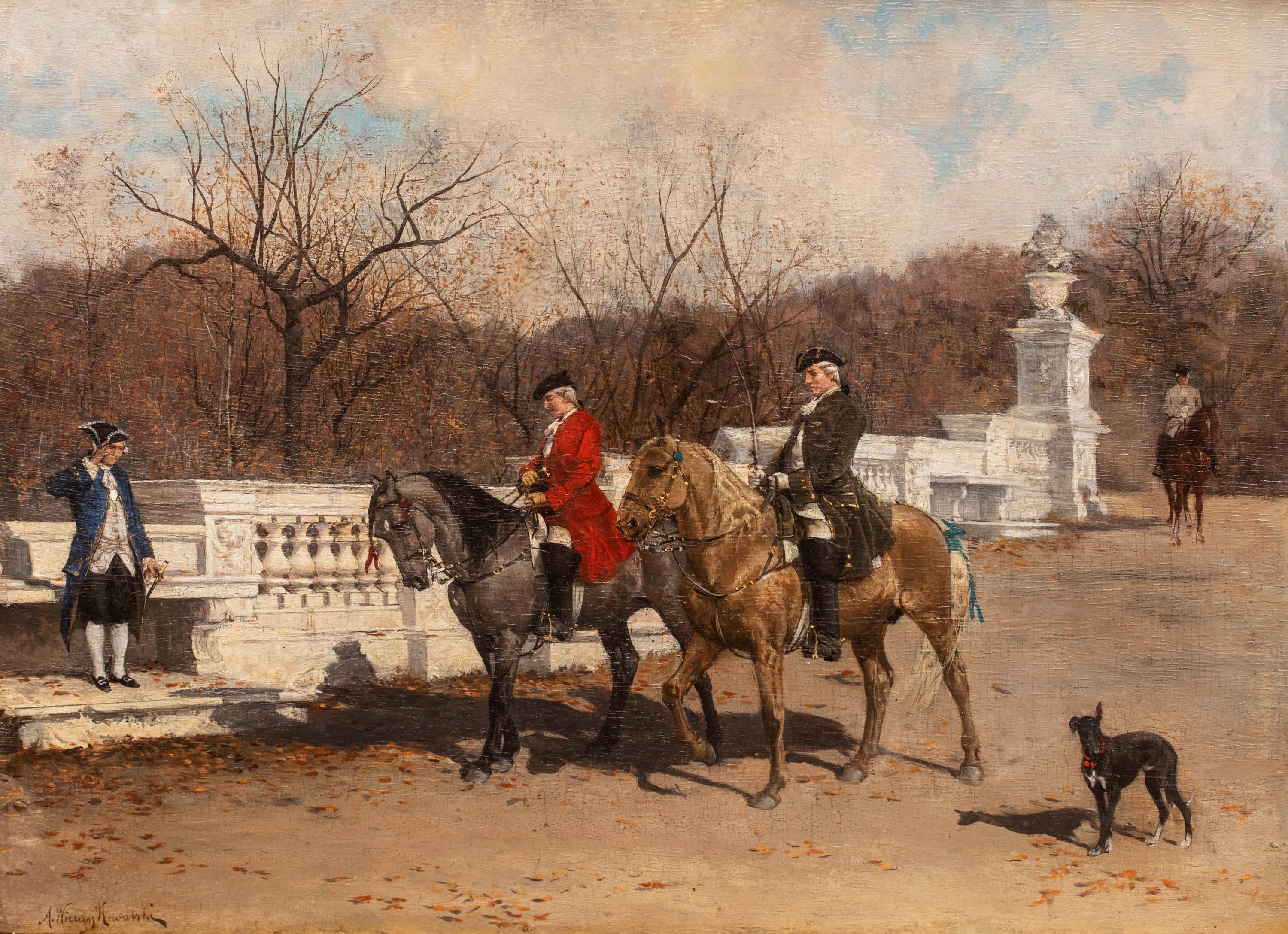 Inspiracją do prezentowanego obrazu były sceny polowań w strojach rokokowych Maksymiliana Gierymskiego (1846–1874). “Wierusz przybył do Monachium latem 1873 roku, kiedy to Gierymski był u szczytu sławy i u kresu krótkiego życia. (...). Wierusz-Kowalski znalazł się w tych tematach, a raczej w scenerii w jakiej zwykło się je przedstawiać wielkie upodobanie. Wszystkie jego zopfy powstały w pierwszym okresie pobytu w stolicy Bawarii, czyli w latach 1873–1880. Przedstawienia są dwojakiego rodzaju. Są to sceny związane w polowaniami lub po prostu konne spacery. Rozróżnienie często jest możliwe tylko dzięki tytułowi, gdyż wszystkie prace mają podobny, charakterystyczny dla zopfów spokojny i pogodny charakter. Artysta malował przede wszystkim kameralne sceny z jednym. dwoma bądź trzema jeźdźcami. (...). Wierusz-Kowalski zaczerpnął z malarstwa Maksymiliana Gierymskiego kostium historyczny i beztroski, w zewnętrznym oglądzie dzieła nastrój. (...) To, co u Gierymskiego było metaforą i odejściem od rzeczywistości, u Wierusza-Kowalskiego pozostało kostiumowym obrazem beztroskiej rozrywki. Tworzył pogodne, rozświetlone jesiennym słońcem sceny, w których jest także zaznaczona charakterystyczna dla niego narracyjność”. (E.Ptaszyńska, op.cit. s. 235). Inne przykłady z tego okresu artysty to m.in. “Na polowaniu (il.5) i “Spacer konny w parku” (il.6) Zdaniem badacza i autora publikacji o monachijczykach – Hansa Petera Bühler`a “obrazy Wierusza-Kowalskiego