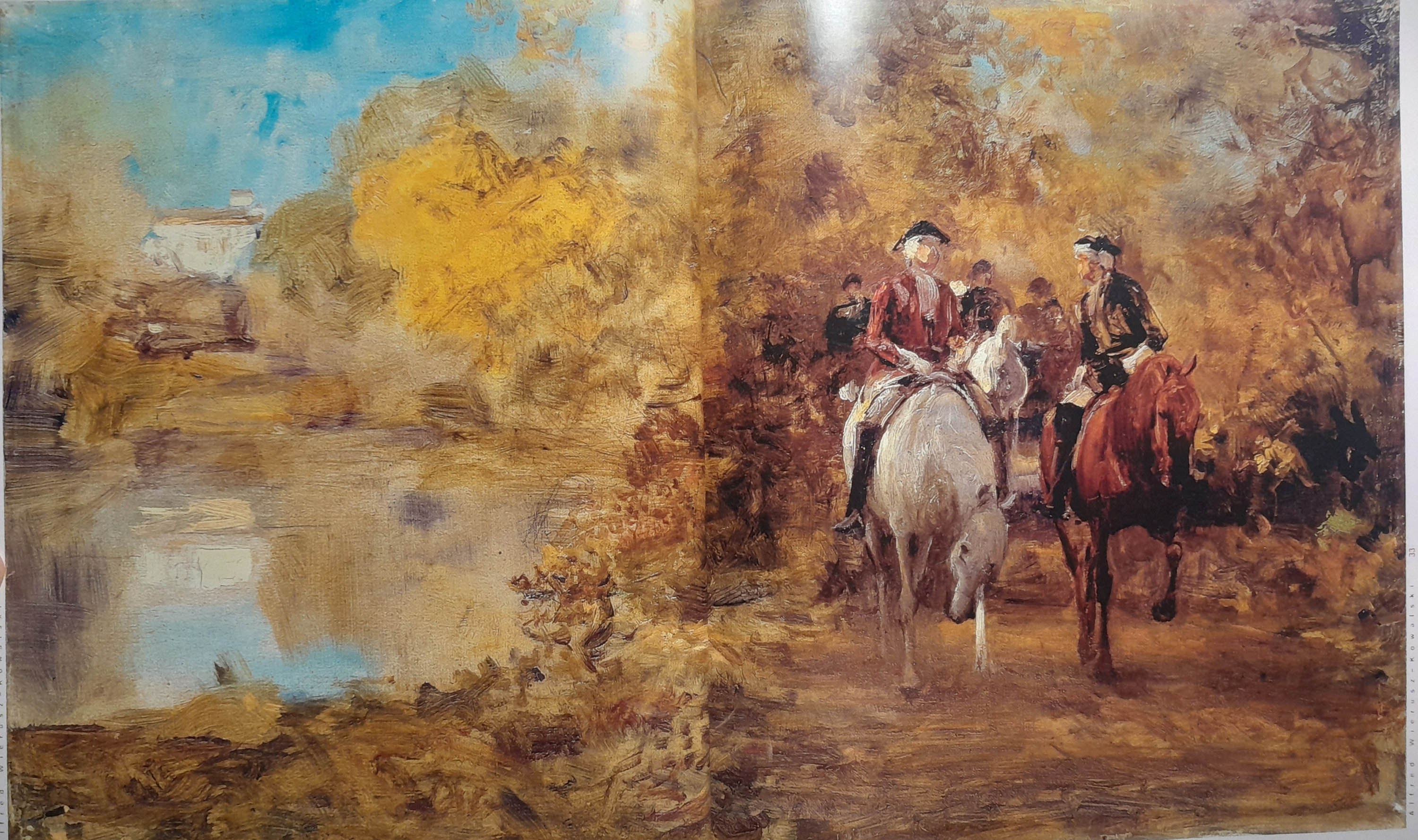 Il. 6 – Spacer konny w parku, około 1880 (olej, płótno, 30 × 54 cm, Zbiory Muzeum Okręgowego w Suwałkach (źródło: E.Ptaszyńska, Alfred Wierusz-Kowalski, wyd.Bosz, 2017, s. 32–33)