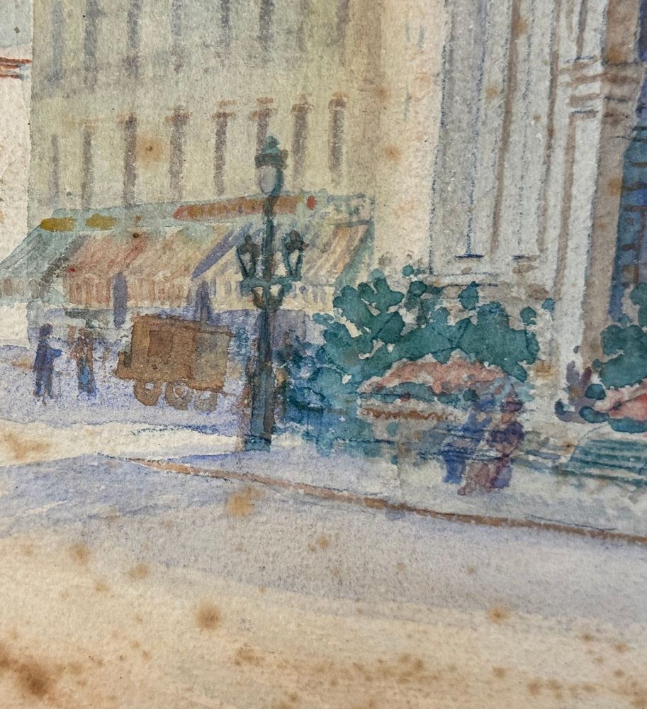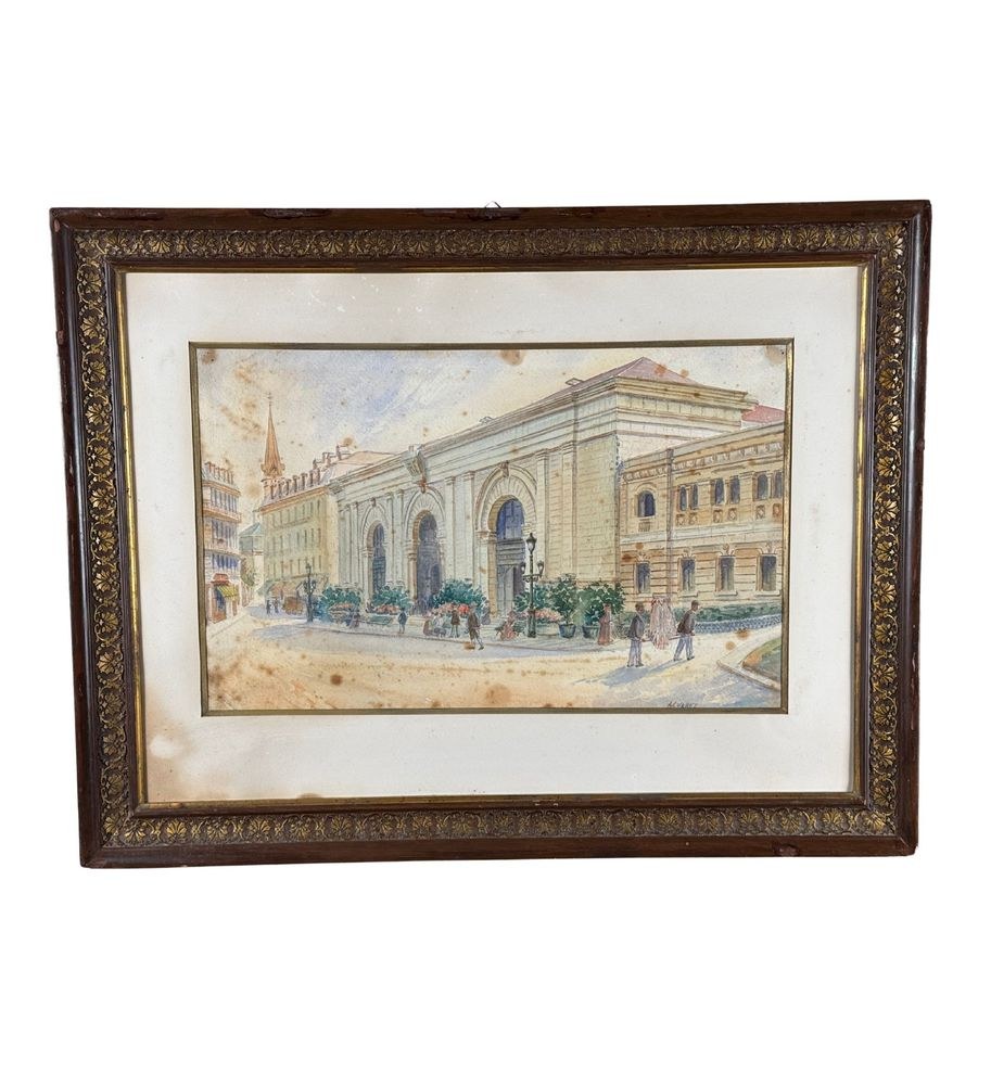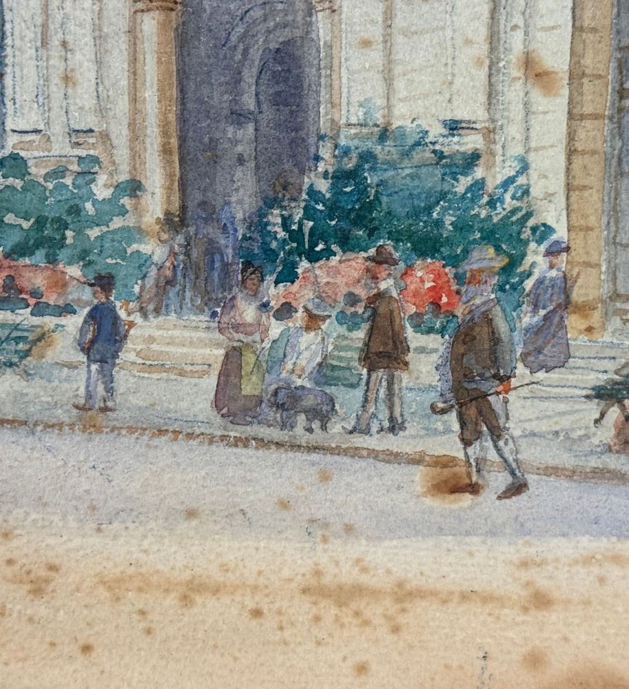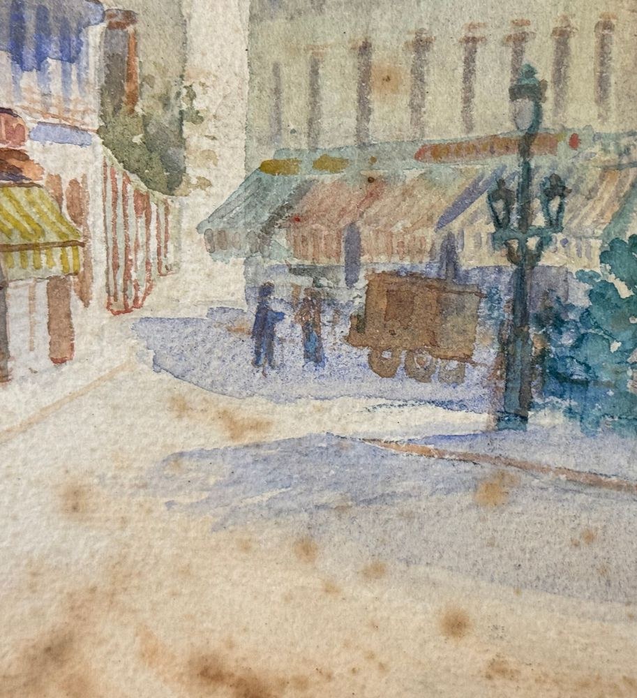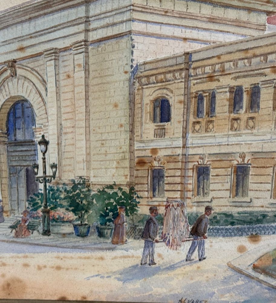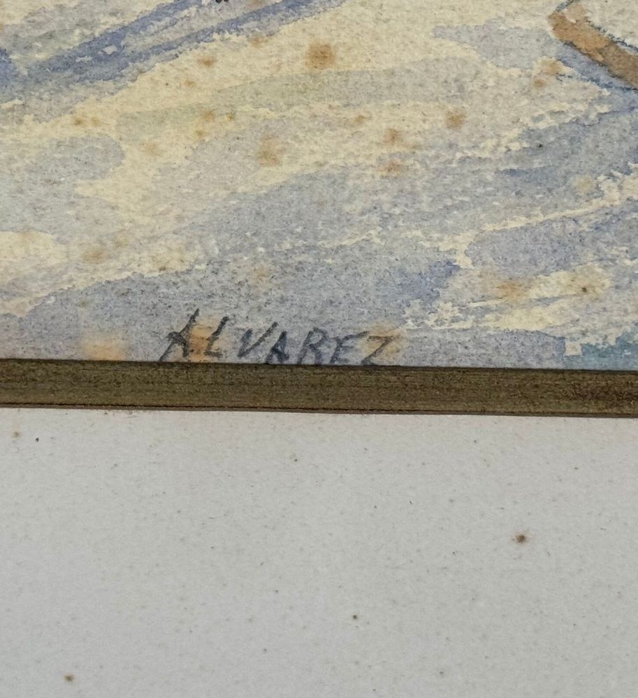 Watercolor on paper, first half of the 20th century, European school, depicting *Strada a Montpellier* (Street in Montpellier). Dimensions including frame: 65x50 cm. Dimensions inside the frame: 45x29 cm. Signed at the bottom right: Alvarez. The work is in good condition with slight signs of wear as shown in the attached photos.