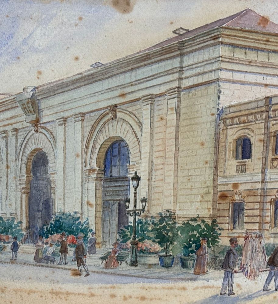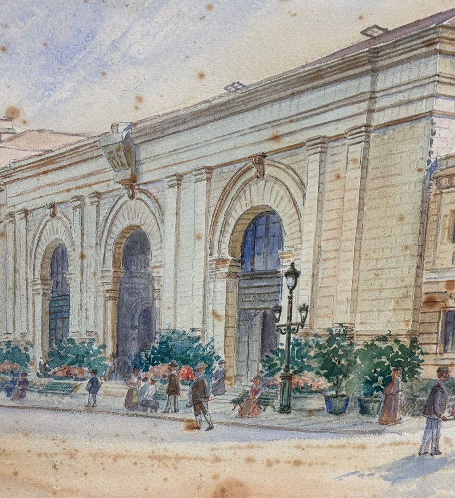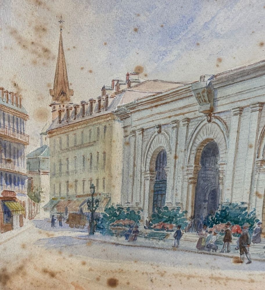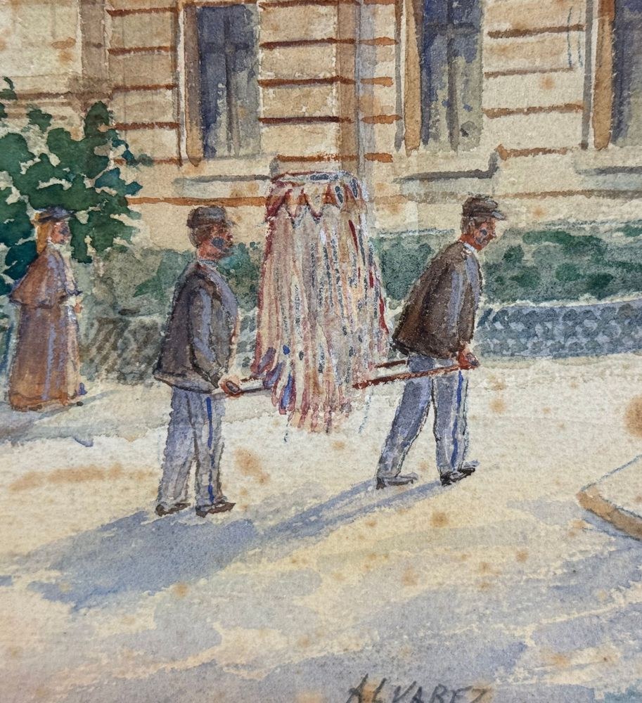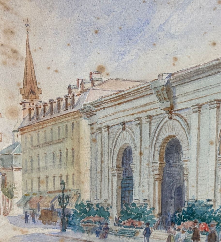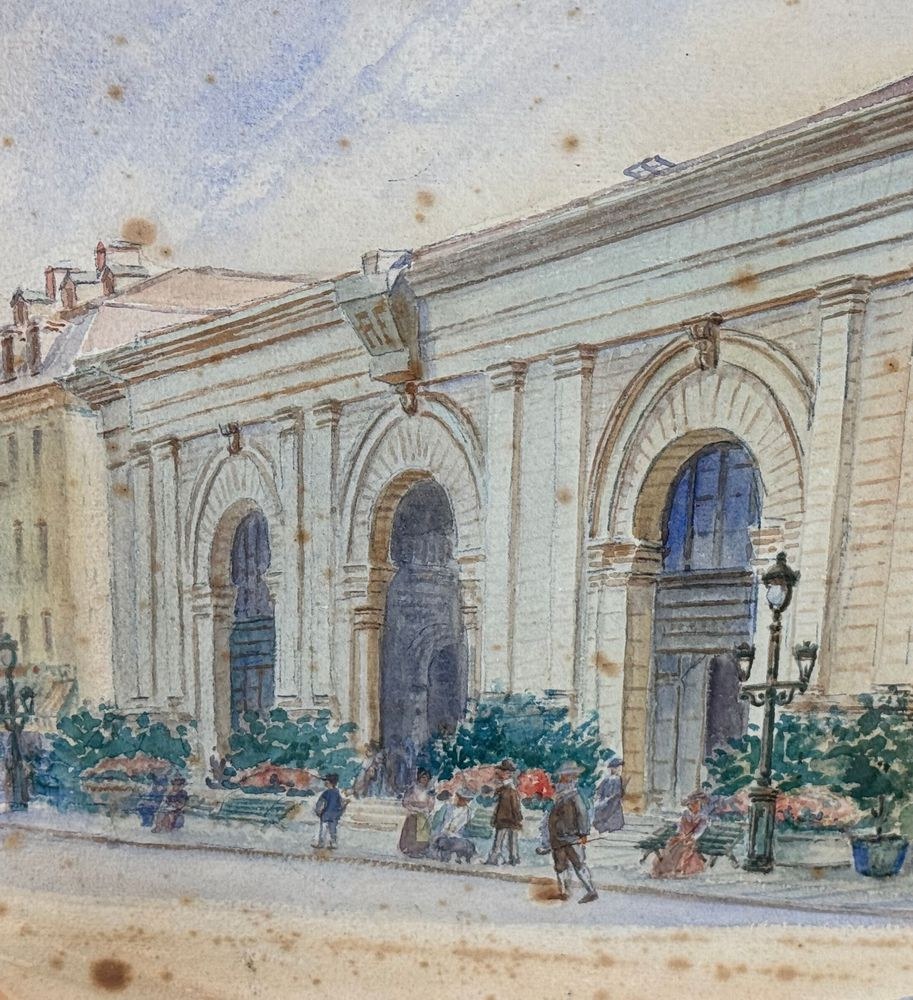 Watercolor on paper, first half of the 20th century, European school, depicting *Strada a Montpellier* (Street in Montpellier). Dimensions including frame: 65x50 cm. Dimensions inside the frame: 45x29 cm. Signed at the bottom right: Alvarez. The work is in good condition with slight signs of wear as shown in the attached photos.