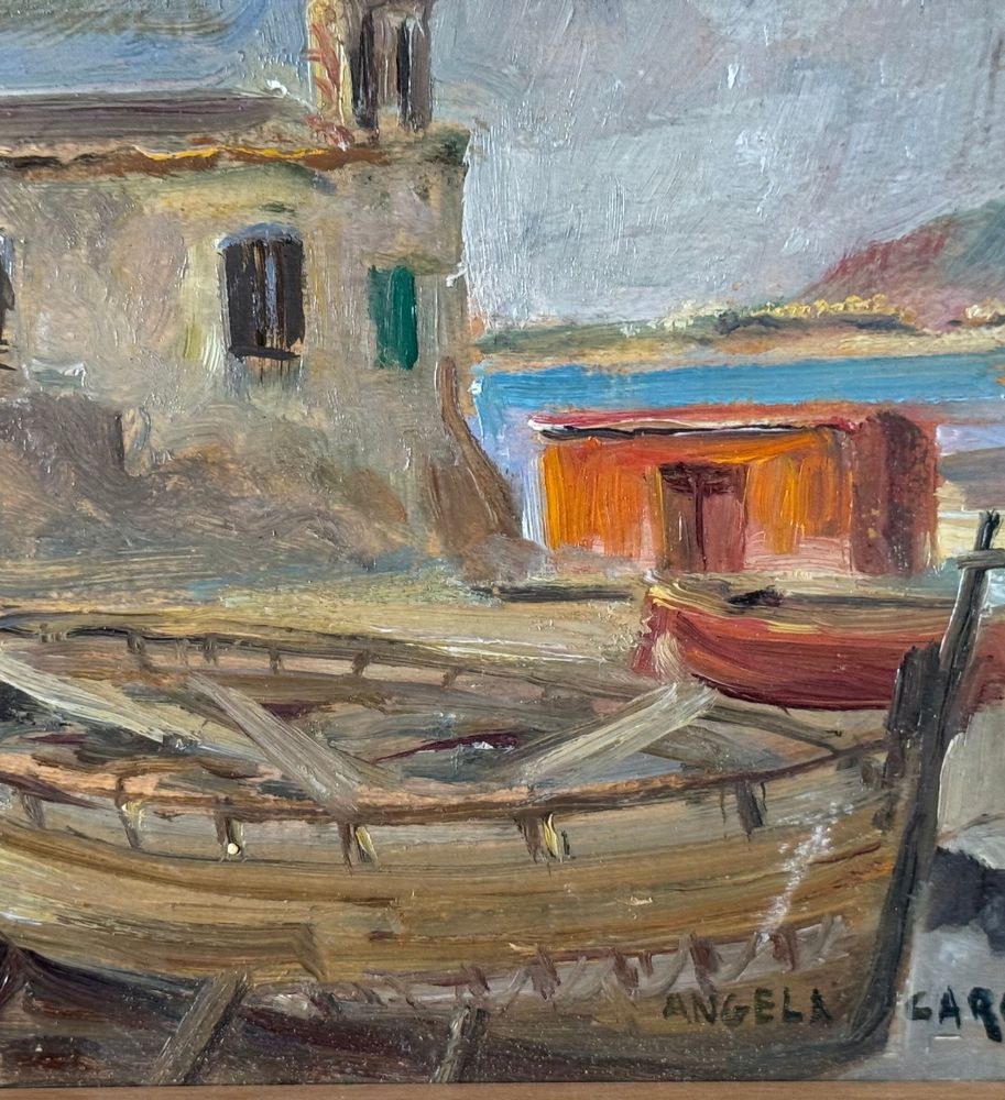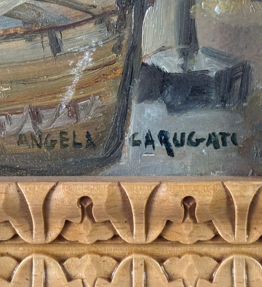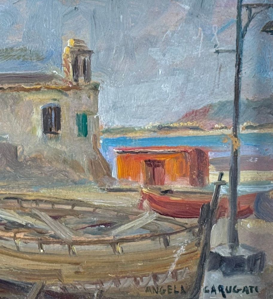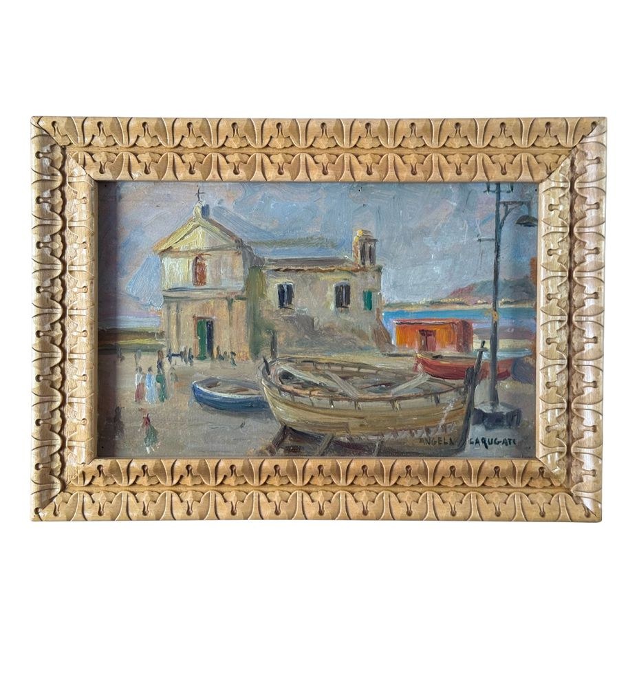 Oil on panel painting, 20th century, Italian school, depicting a seaside view with a small church and boats. Dimensions including frame: 42 x 30 cm. Inner frame dimensions: 34 x 21 cm. Signed lower right *Angela Carugati*. The artwork is in good condition.